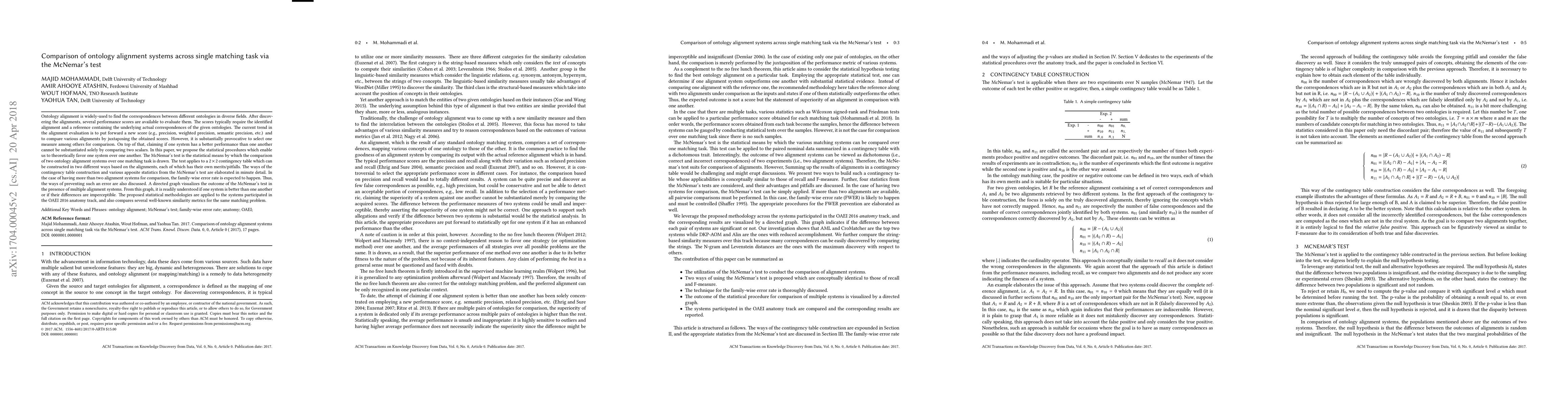 Ontology alignment is widely-used to find the correspondences between different ontologies in diverse fields.After discovering the alignments,several performance scores are available to evaluate them.The scores typically require the identified alignment and a reference containing the underlying actual correspondences of the given ontologies.The current trend in the alignment evaluation is to put forward a new score(e.g., precision, weighted precision, etc.)and to compare various alignments by juxtaposing the obtained scores. However,it is substantially provocative to select one measure among others for comparison.On top of that, claiming if one system has a better performance than one another cannot be substantiated solely by comparing two scalars.In this paper,we propose the statistical procedures which enable us to theoretically favor one system over one another.The McNemar's test is the statistical means by which the comparison of two ontology alignment systems over one matching task is drawn.The test applies to a 2x2 contingency table which can be constructed in two different ways based on the alignments,each of which has their own merits/pitfalls.The ways of the contingency table construction and various apposite statistics from the McNemar's test are elaborated in minute detail.In the case of having more than two alignment systems for comparison, the family-wise error rate is expected to happen. Thus, the ways of preventing such an error are also discussed.A directed graph visualizes the outcome of the McNemar's test in the presence of multiple alignment systems.From this graph, it is readily understood if one system is better than one another or if their differences are imperceptible.The proposed statistical methodologies are applied to the systems participated in the OAEI 2016 anatomy track, and also compares several well-known similarity metrics for the same matching problem.