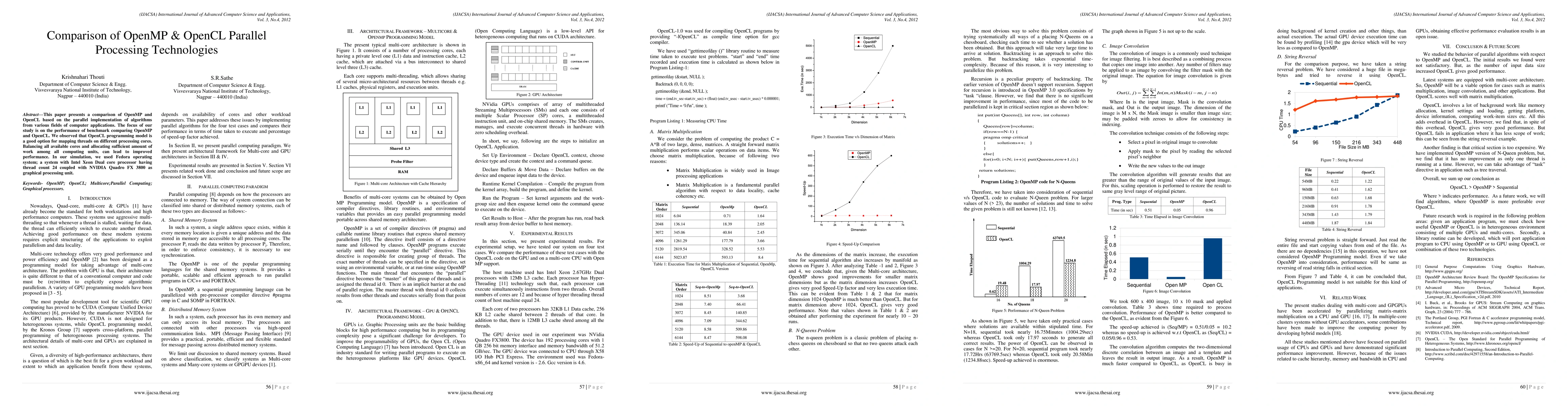 This paper compares OpenMP and OpenCL for parallel processing, finding that OpenCL is effective for distributing threads across various cores, leading to improved performance when balancing workload. The study uses Fedora OS with an Intel Xeon Dual core processor and a GPU for benchmarking.