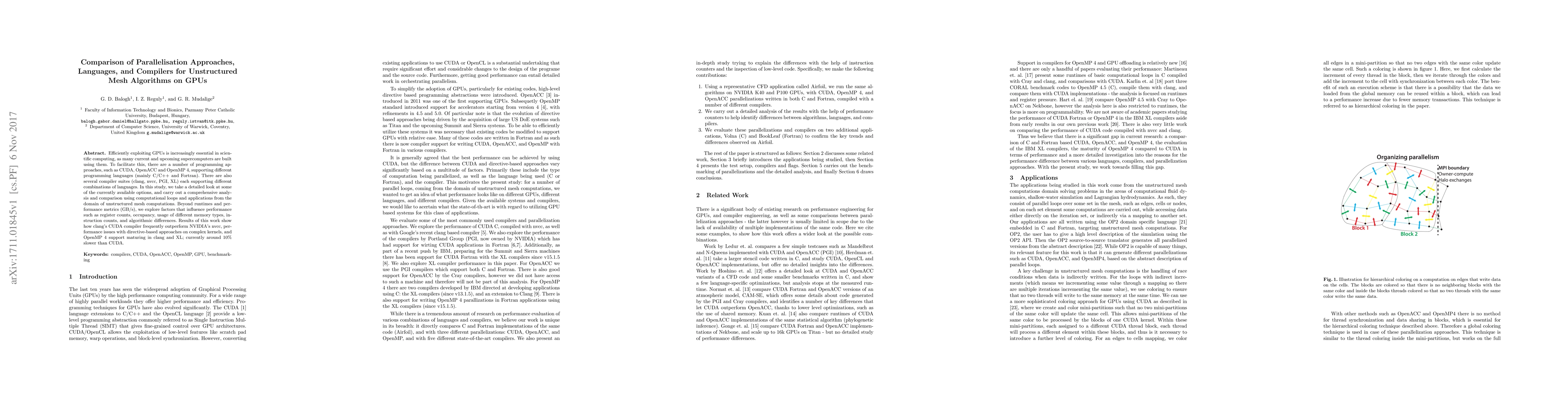 Efficiently exploiting GPUs is increasingly essential in scientific computing, as many current and upcoming supercomputers are built using them. To facilitate this, there are a number of programming approaches, such as CUDA, OpenACC and OpenMP 4, supporting different programming languages (mainly C/C++ and Fortran). There are also several compiler suites (clang, nvcc, PGI, XL) each supporting different combinations of languages. In this study, we take a detailed look at some of the currently available options, and carry out a comprehensive analysis and comparison using computational loops and applications from the domain of unstructured mesh computations. Beyond runtimes and performance metrics (GB/s), we explore factors that influence performance such as register counts, occupancy, usage of different memory types, instruction counts, and algorithmic differences. Results of this work show how clang's CUDA compiler frequently outperform NVIDIA's nvcc, performance issues with directive-based approaches on complex kernels, and OpenMP 4 support maturing in clang and XL; currently around 10% slower than CUDA.