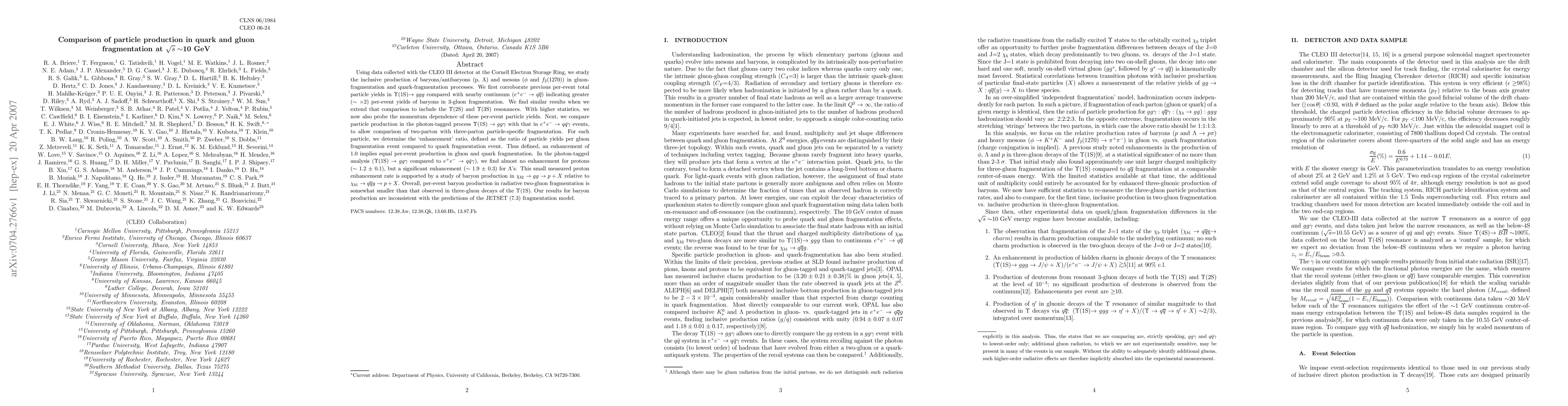 Using data collected with the CLEO III detector at the Cornell Electron Storage Ring, we study the inclusive production of baryons/antibaryons (p, /) and mesons (phi and f_2(1270)) in gluon-fragmentation and quark-fragmentation processes. We first corroborate previous per-event total particle yields in Upsilon(1S)->ggg compared with nearby continuum (e+e- -> qqbar) indicating greater (x2) per-event yields of baryons in 3-gluon fragmentation. We find similar results when we extend that comparison to include the Upsilon(2S) and Upsilon(3S) resonances. With higher statistics, we now also probe the momentum dependence of these per-event particle yields. Next, we compare particle production in the photon-tagged process Upsilon(1S)->gggamma with that in e+e- -> qqbar events, to allow comparison of two-parton with three-parton particle-specific fragmentation. For each particle, we determine the `enhancement' ratio, defined as the ratio of particle yields per gluon fragmentation event compared to quark fragmentation event. Thus defined, an enhancement of 1.0 implies equal per-event production in both gluon and quark fragmentation. In the photon-tagged analysis (U(1S)->gggamma compared to e+e- -> qqbar+gamma), we find almost no enhancement for protons (1.2+/-0.1), but a significant enhancement (1.9+/-0.3) for /\'s. Overall, per-event baryon production in radiative two-gluon fragmentation is somewhat smaller than that observed in three-gluon decays of the Upsilon(1S). Our results for baryon production are inconsistent with the predictions of the JETSET (7.3) fragmentation model.