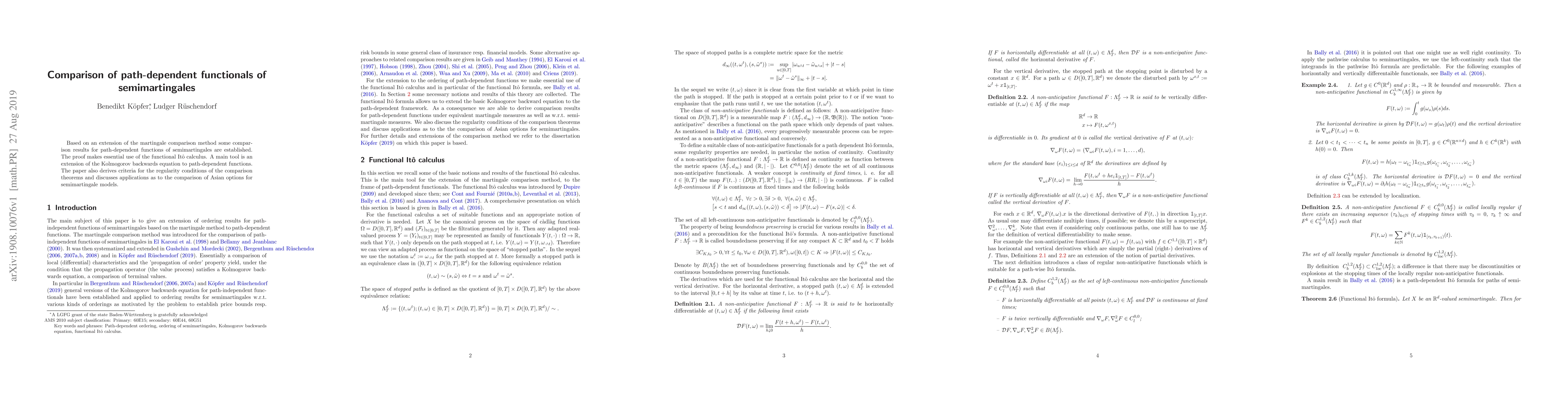 Based on an extension of the martingale comparison method some comparison results for path-dependent functions of semimartingales are established. The proof makes essential use of the functional It\^o calculus. A main tool is an extension of the Kolmogorov backwards equation to path-dependent functions. The paper also derives criteria for the regularity conditions of the comparison theorems and discusses applications as to the comparison of Asian options for semimartingale models.