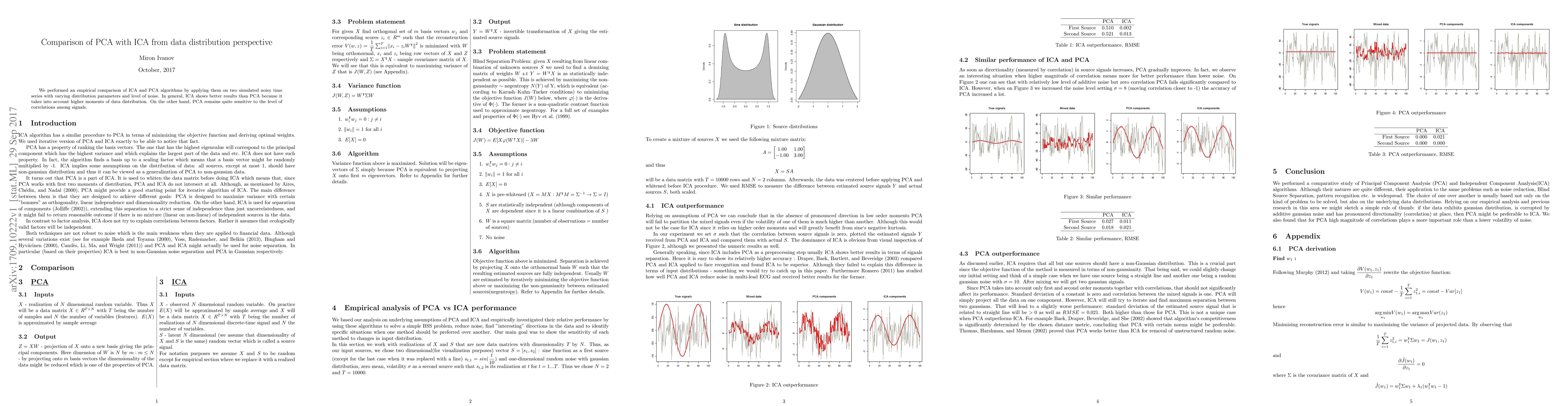 We performed an empirical comparison of ICA and PCA algorithms by applying them on two simulated noisy time series with varying distribution parameters and level of noise. In general, ICA shows better results than PCA because it takes into account higher moments of data distribution. On the other hand, PCA remains quite sensitive to the level of correlations among signals.