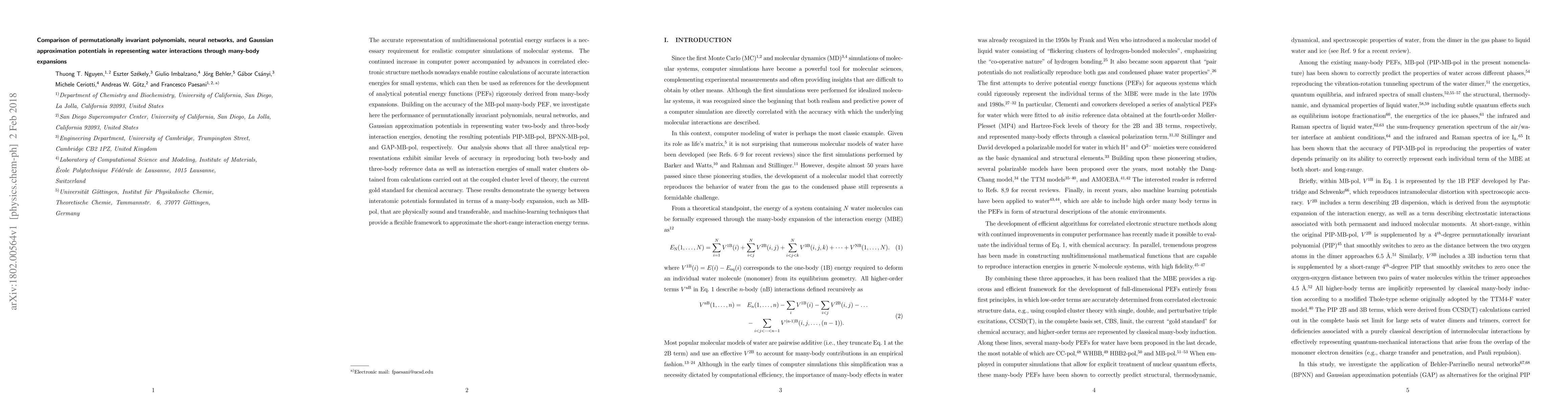 This paper compares permutationally invariant polynomials, neural networks, and Gaussian approximation potentials in representing water interactions derived from many-body expansions. It finds that all three methods achieve similar accuracy in reproducing reference interaction energies, highlighting the synergy between physically sound many-body potentials and flexible machine-learning techniques.