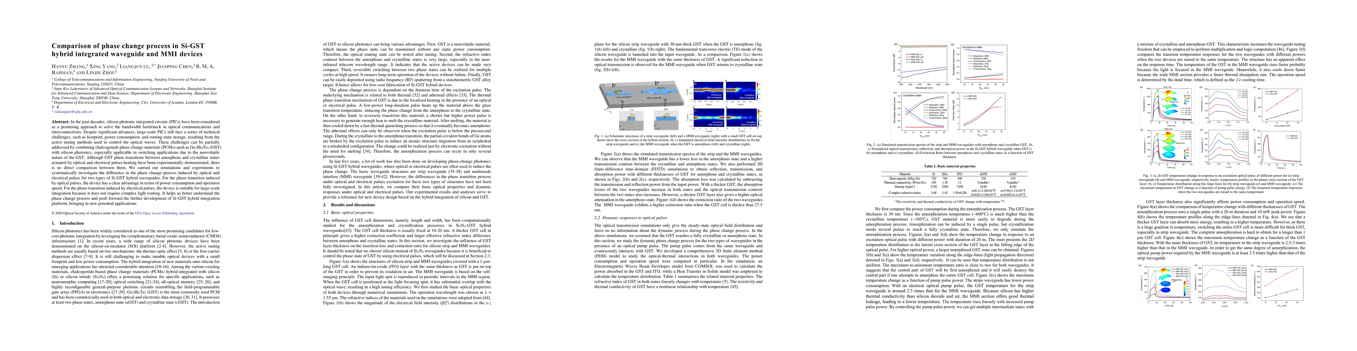 This paper compares the phase change processes in Si-GST hybrid integrated waveguides and MMI devices using optical and electrical pulses. Optical pulses offer lower power consumption and faster operation, while electrical pulses are more suitable for large-scale integration due to simpler light routing.