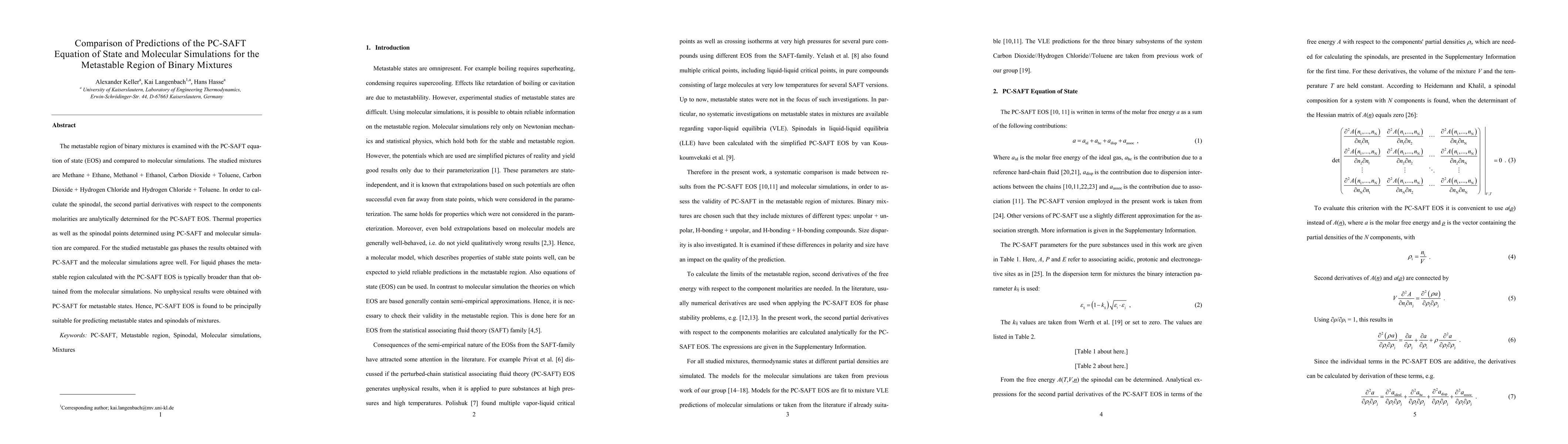 The metastable region of binary mixtures is examined with the PC-SAFT equa-tion of state (EOS) and compared to molecular simulations. The studied mixtures are Methane + Ethane, Methanol + Ethanol, Carbon Dioxide + Toluene, Carbon Dioxide + Hydrogen Chloride and Hydrogen Chloride + Toluene. In order to cal-culate the spinodal, the second partial derivatives with respect to the components molarities are analytically determined for the PC-SAFT EOS. Thermal properties as well as the spinodal points determined using PC-SAFT and molecular simula-tion are compared. For the studied metastable gas phases the results obtained with PC-SAFT and the molecular simulations agree well. For liquid phases the meta-stable region calculated with the PC-SAFT EOS is typically broader than that ob-tained from the molecular simulations. No unphysical results were obtained with PC-SAFT for metastable states. Hence, PC-SAFT EOS is found to be principally suitable for predicting metastable states and spinodals of mixtures.