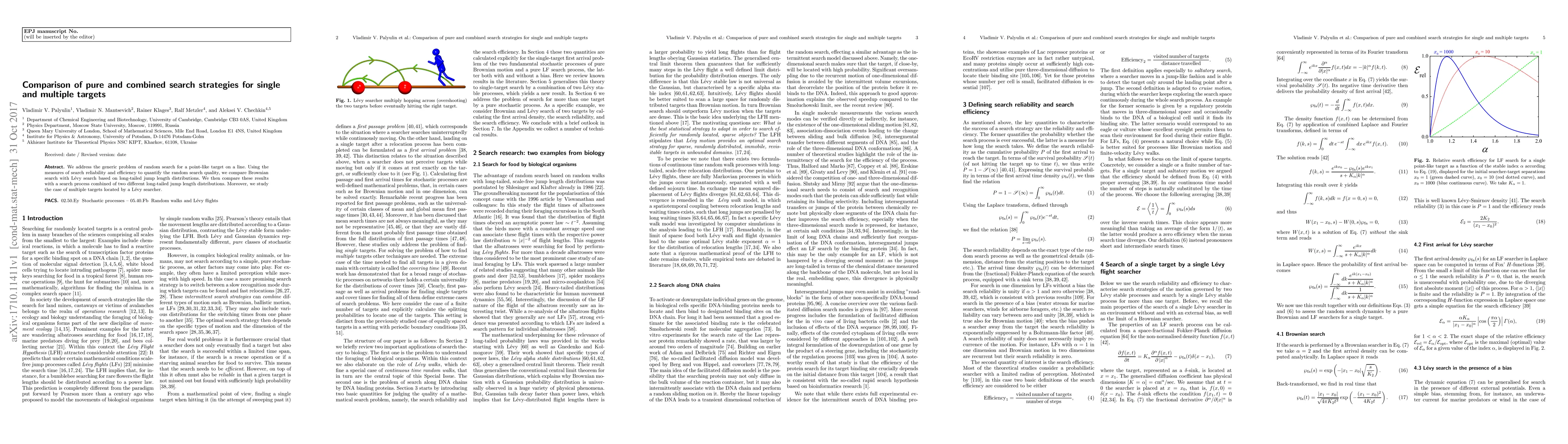 We address the generic problem of random search for a point-like target on a line. Using the measures of search reliability and efficiency to quantify the random search quality, we compare Brownian search with L\'evy search based on long-tailed jump length distributions. We then compare these results with a search process combined of two different long-tailed jump length distributions. Moreover, we study the case of multiple targets located by a L\'evy searcher.