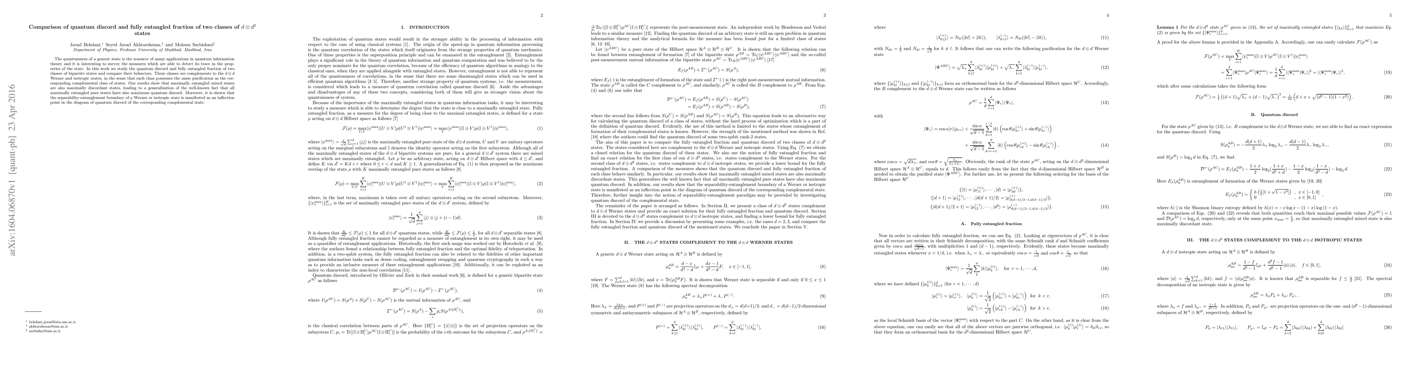The quantumness of a generic state is the resource of many applications in quantum information theory and it is interesting to survey the measures which are able to detect its trace in the properties of the state. In this work we study the quantum discord and fully entangled fraction of two classes of bipartite states and compare their behaviors. These classes are complements to the $d\otimes d$ Werner and isotropic states, in the sense that each class possesses the same purification as the corresponding complemental class of states. Our results show that maximally entangled mixed states are also maximally discordant states, leading to a generalization of the well-known fact that all maximally entangled pure states have also maximum quantum discord. Moreover, it is shown that the separability-entanglement boundary of a Werner or isotropic state is manifested as an inflection point in the diagram of quantum discord of the corresponding complemental state.