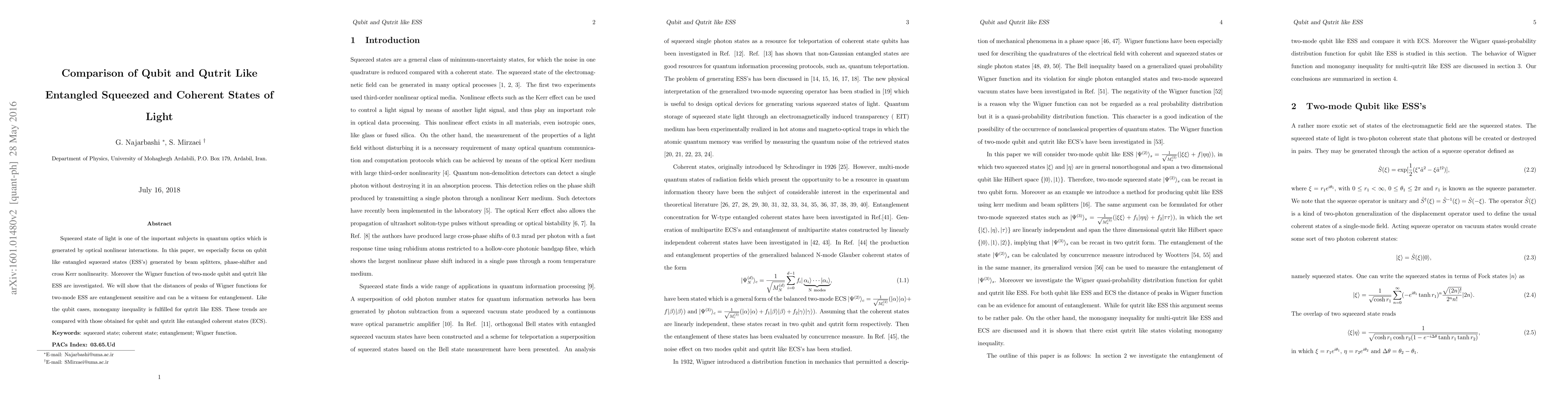 Squeezed state of light is one of the important subjects in quantum optics which is generated by optical nonlinear interactions. In this paper, we especially focus on qubit like entangled squeezed states (ESS's) generated by beam splitters, phase-shifter and cross Kerr nonlinearity. Moreover the Wigner function of two-mode qubit and qutrit like ESS are investigated. We will show that the distances of peaks of Wigner functions for two-mode ESS are entanglement sensitive and can be a witness for entanglement. Like the qubit cases, monogamy inequality is fulfilled for qutrit like ESS. These trends are compared with those obtained for qubit and qutrit like entangled coherent states (ECS).