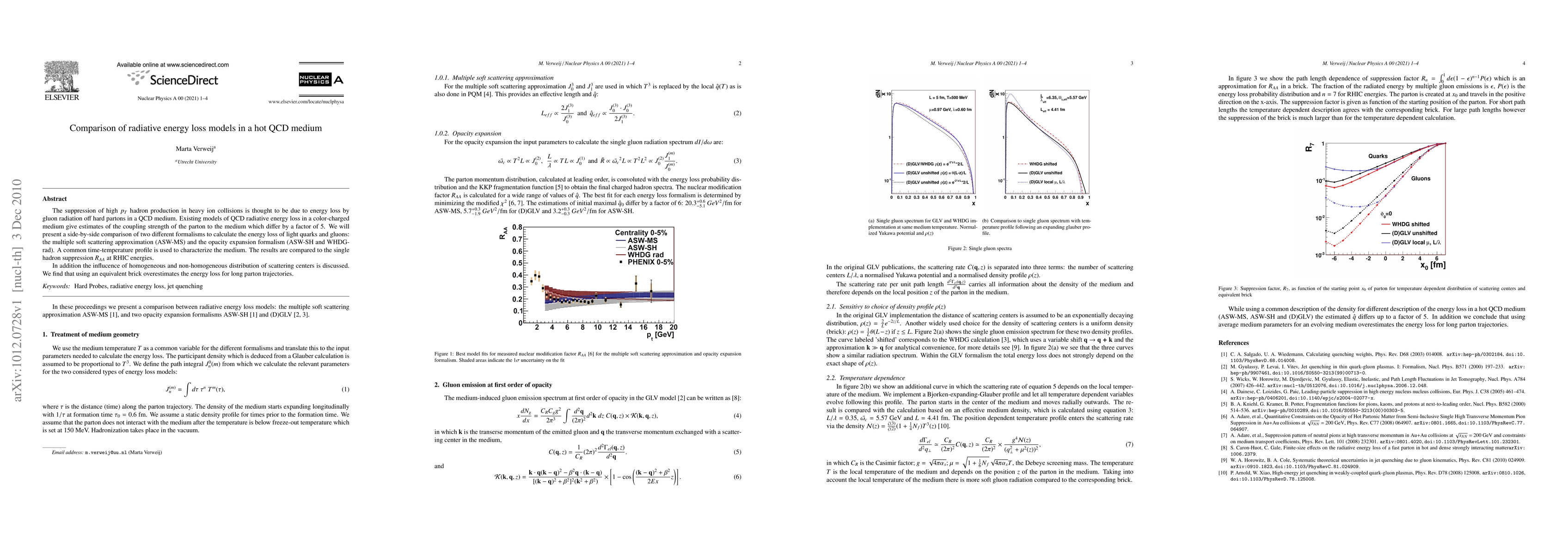 The suppression of high $p_{T}$ hadron production in heavy ion collisions is thought to be due to energy loss by gluon radiation off hard partons in a QCD medium. Existing models of QCD radiative energy loss in a color-charged medium give estimates of the coupling strength of the parton to the medium which differ by a factor of $5$. We will present a side-by-side comparison of two different formalisms to calculate the energy loss of light quarks and gluons: the multiple soft scattering approximation (ASW-MS) and the opacity expansion formalism (ASW-SH and WHDG-rad). A common time-temperature profile is used to characterize the medium. The results are compared to the single hadron suppression $R_{AA}$ at RHIC energies. In addition the influcence of homogeneous and non-homogeneous distribution of scattering centers is discussed. We find that using an equivalent brick overestimates the energy loss for long parton trajectories.