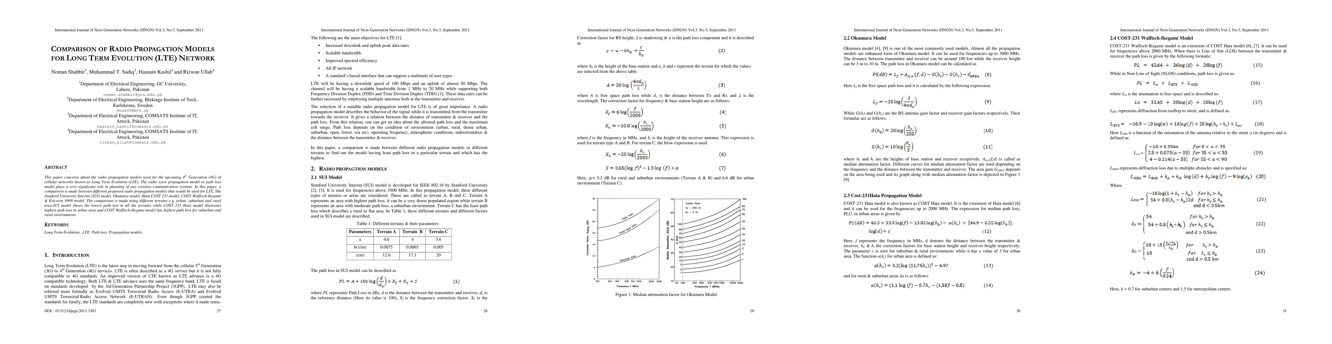 This paper compares various radio propagation models for LTE networks, including the SUI, Okumura, Hata COST 231, and COST Walfisch-Ikegami models, across different terrains. The SUI model exhibits the lowest path loss, while the Hata COST 231 model shows the highest in urban areas, and the COST Walfisch-Ikegami model has the highest in suburban and rural environments.