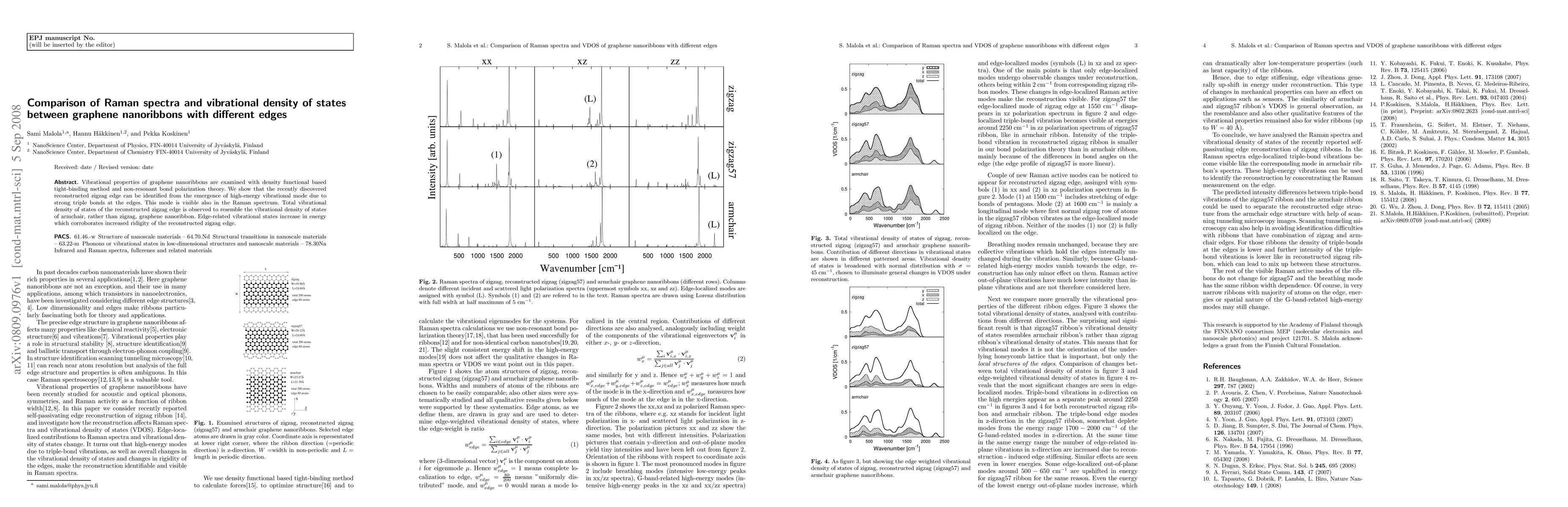 This study uses density functional theory to analyze the vibrational properties of graphene nanoribbons, identifying a high-energy mode in Raman spectra from reconstructed zigzag edges due to strong triple bonds. The vibrational density of states for these edges more closely resembles that of armchair edges, with edge-related states increasing in energy, indicating greater rigidity.