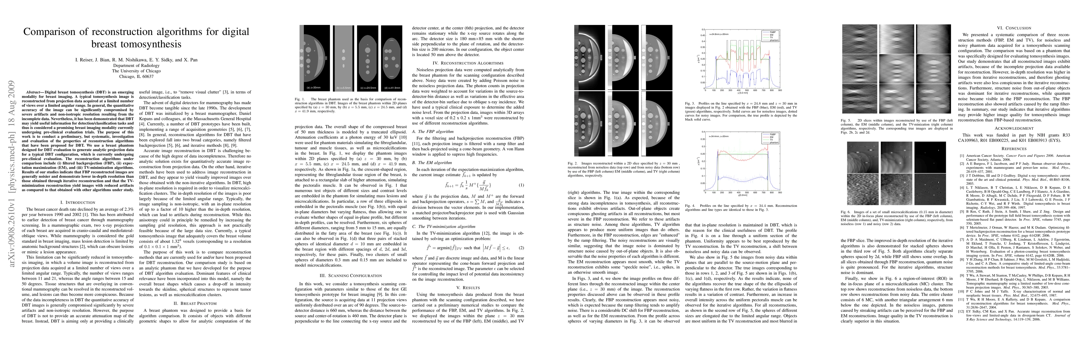 This paper compares reconstruction algorithms for digital breast tomosynthesis (DBT), evaluating filtered backprojection (FBP), expectation maximization (EM), and TV-minimization methods. Results show that FBP yields noisier images with lower resolution, while TV-minimization provides better artifact reduction.
