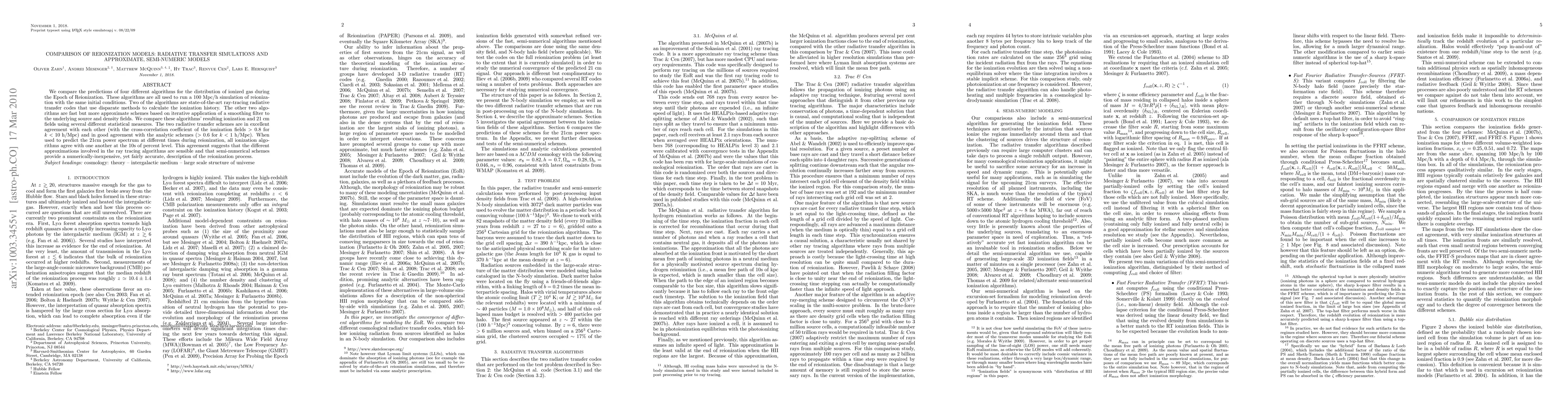 We compare the predictions of four different algorithms for the distribution of ionized gas during the Epoch of Reionization. These algorithms are all used to run a 100 Mpc/h simulation of reionization with the same initial conditions. Two of the algorithms are state-of-the-art ray-tracing radiative transfer codes that use disparate methods to calculate the ionization history. The other two algorithms are fast but more approximate schemes based on iterative application of a smoothing filter to the underlying source and density fields. We compare these algorithms' resulting ionization and 21 cm fields using several different statistical measures. The two radiative transfer schemes are in excellent agreement with each other (with the cross-correlation coefficient of the ionization fields >0.8 for k < 10 h/Mpc and in good agreement with the analytic schemes (>0.6 for k < 1 h/Mpc). When used to predict the 21cm power spectrum at different times during reionization, all ionization algorithms agree with one another at the 10s of percent level. This agreement suggests that the different approximations involved in the ray tracing algorithms are sensible and that semi-numerical schemes provide a numerically-inexpensive, yet fairly accurate, description of the reionization process.