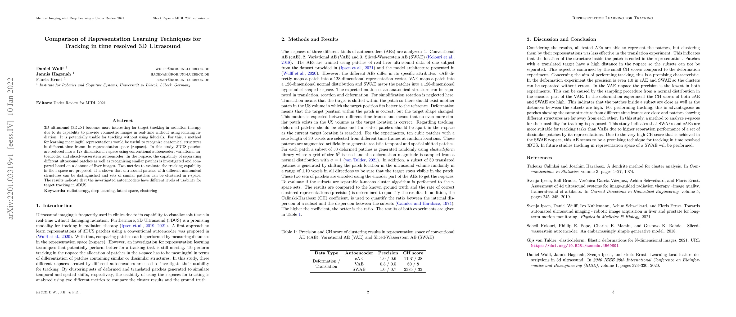 This study compares representation learning techniques—conventional autoencoder, variational autoencoder, and sliced-wasserstein autoencoder—for tracking anatomical structures in time-resolved 3D ultrasound images. The results show that these methods can distinguish different anatomical structures and cluster similar patches, indicating varying levels of usability for target tracking in 3DUS.