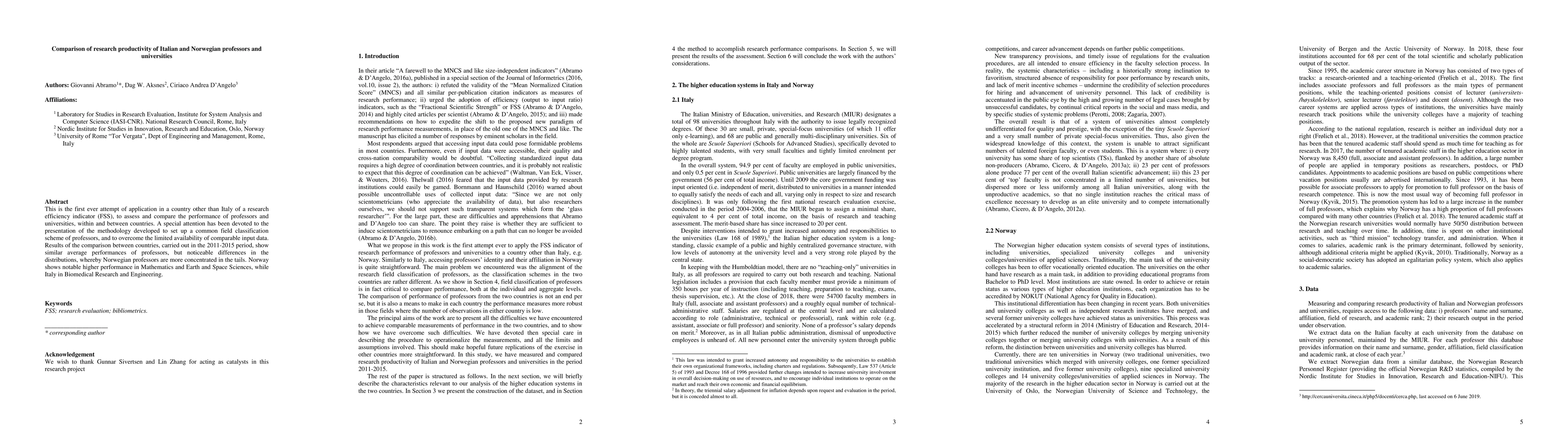 This study introduces a research efficiency indicator to compare Italian and Norwegian professors and universities, revealing similar average performances but notable differences in distribution, with Norwegian professors excelling in Mathematics and Earth and Space Sciences, and Italians in Biomedical Research and Engineering.