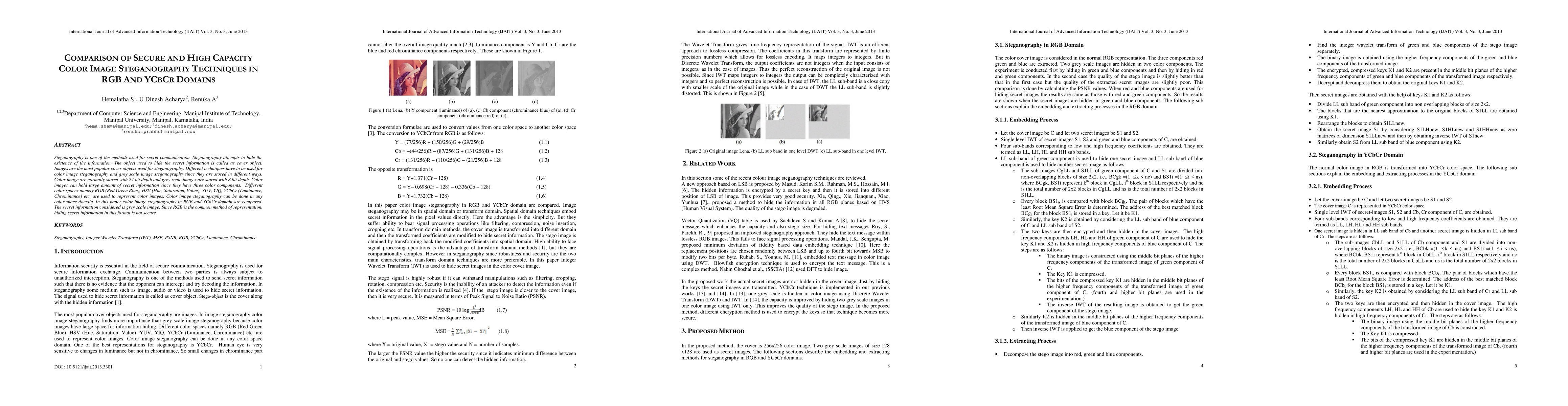 This paper compares secure and high-capacity color image steganography techniques in the RGB and YCbCr domains, focusing on hiding grayscale secret information. It finds that while RGB is common, it lacks security, whereas YCbCr offers better performance.