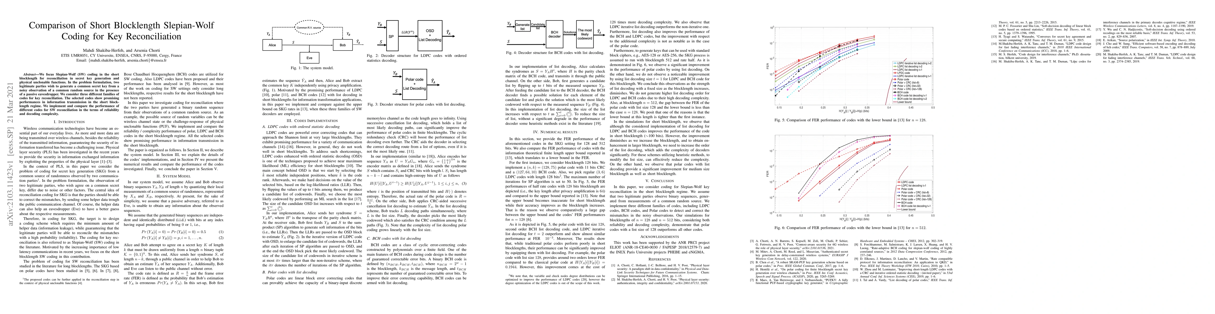 Researchers compared three families of Slepian-Wolf codes for generating a common secret key from noisy observations in the presence of an eavesdropper, finding promising results in short blocklength regimes.