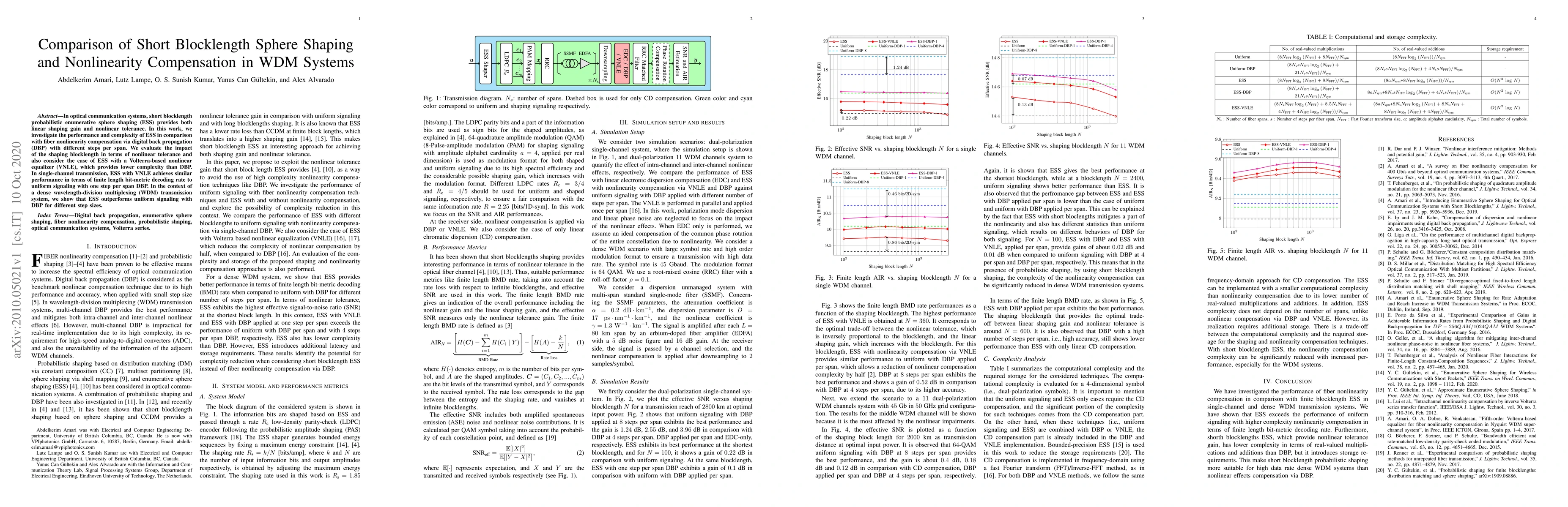 This paper compares the performance and complexity of short blocklength sphere shaping (ESS) with digital back propagation (DBP) for fiber nonlinearity compensation in WDM systems. ESS with a Volterra-based nonlinear equalizer (VNLE) achieves similar performance to uniform signaling with one step per span DBP, while ESS outperforms uniform signaling with DBP in WDM systems.