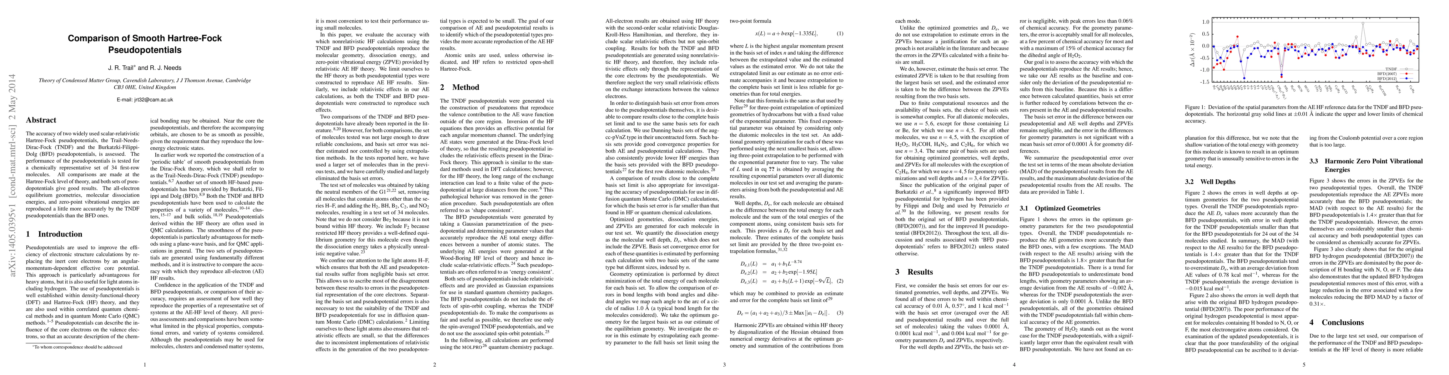 The accuracy of two widely used scalar-relativistic Hartree-Fock pseudopotentials, the Trail-Needs-Dirac-Fock (TNDF) and the Burkatzki-Filippi-Dolg (BFD) pseudopotentials, is assessed. The performance of the pseudopotentials is tested for a chemically representative set of 34 first-row molecules. All comparisons are made at the Hartree-Fock level of theory, and both sets of pseudopotentials give good results. The all-electron equilibrium geometries, molecular dissociation energies, and zero-point vibrational energies are reproduced a little more accurately by the TNDF pseudopotentials than the BFD ones.
