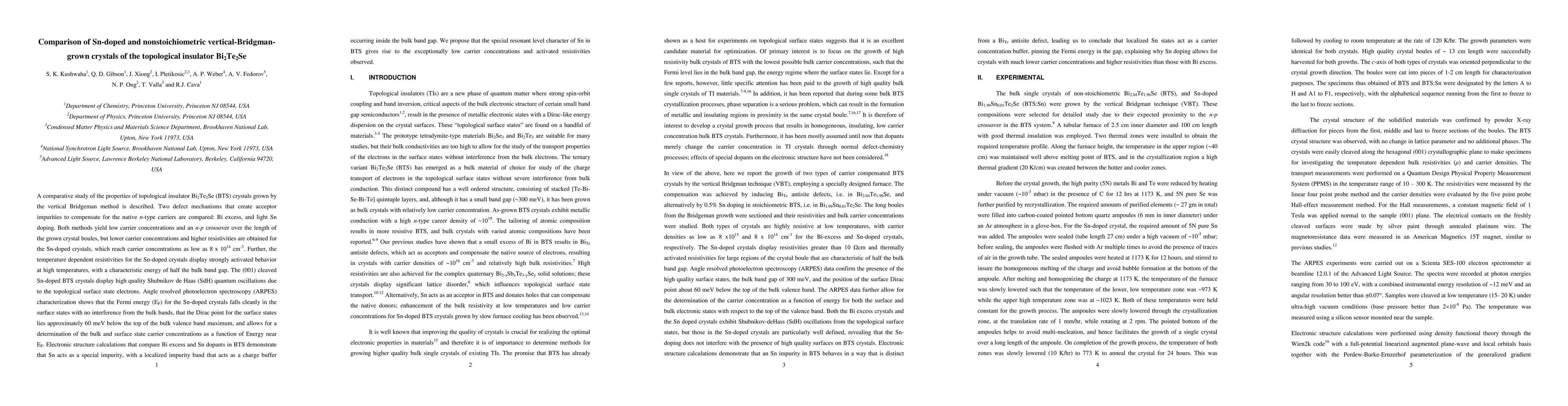 A comparative study of the properties of topological insulator Bi2Te2Se (BTS) crystals grown by the vertical Bridgeman method is described. Two defect mechanisms that create acceptor impurities to compensate for the native n-type carriers are compared: Bi excess, and light Sn doping. Both methods yield low carrier concentrations and an n-p crossover over the length of the grown crystal boules, but lower carrier concentrations and higher resistivities are obtained for the Sn-doped crystals, which reach carrier concentrations as low as 8 x 1014 cm-3. Further, the temperature dependent resistivities for the Sn-doped crystals display strongly activated behavior at high temperatures, with a characteristic energy of half the bulk band gap. The (001) cleaved Sn-doped BTS crystals display high quality Shubnikov de Haas (SdH) quantum oscillations due to the topological surface state electrons. Angle resolved photoelectron spectroscopy (ARPES) characterization shows that the Fermi energy (EF) for the Sn-doped crystals falls cleanly in the surface states with no interference from the bulk bands, that the Dirac point for the surface states lies approximately 60 meV below the top of the bulk valence band maximum, and allows for a determination of the bulk and surface state carrier concentrations as a function of Energy near EF. Electronic structure calculations that compare Bi excess and Sn dopants in BTS demonstrate that Sn acts as a special impurity, with a localized impurity band that acts as a charge buffer occurring inside the bulk band gap. We propose that the special resonant level character of Sn in BTS gives rise to the exceptionally low carrier concentrations and activated resistivities observed.