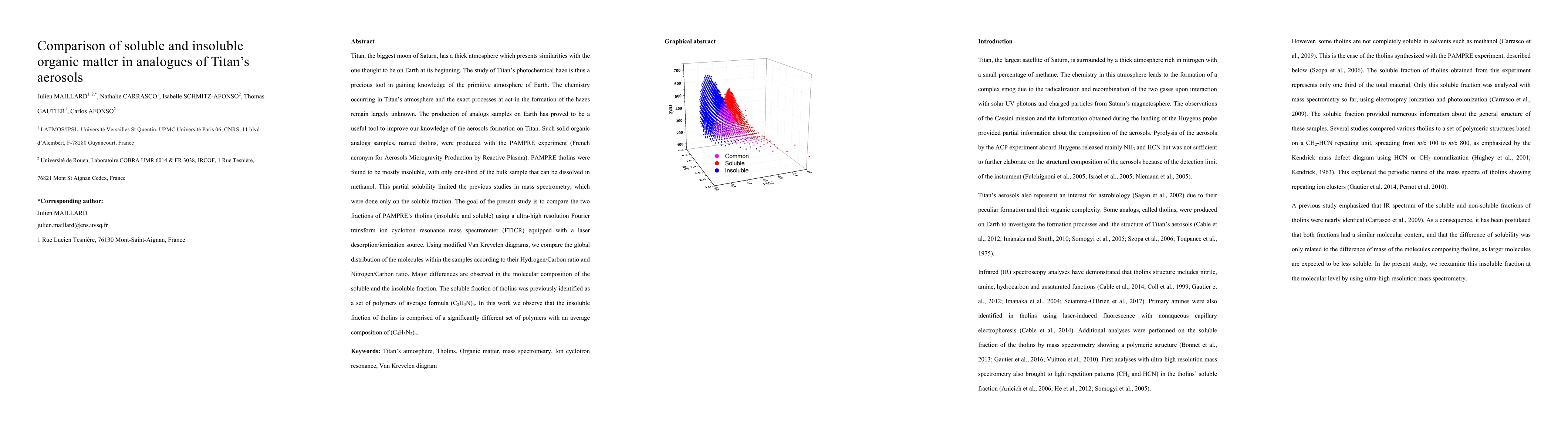 This study compares soluble and insoluble fractions of PAMPRE tholins, analogs of Titan's aerosols, using ultra-high resolution FTICR mass spectrometry. The soluble fraction consists of polymers with an average formula (C2H3N)n, while the insoluble fraction contains polymers with a different composition, (C4H3N2)n, indicating significant molecular differences between the two fractions.