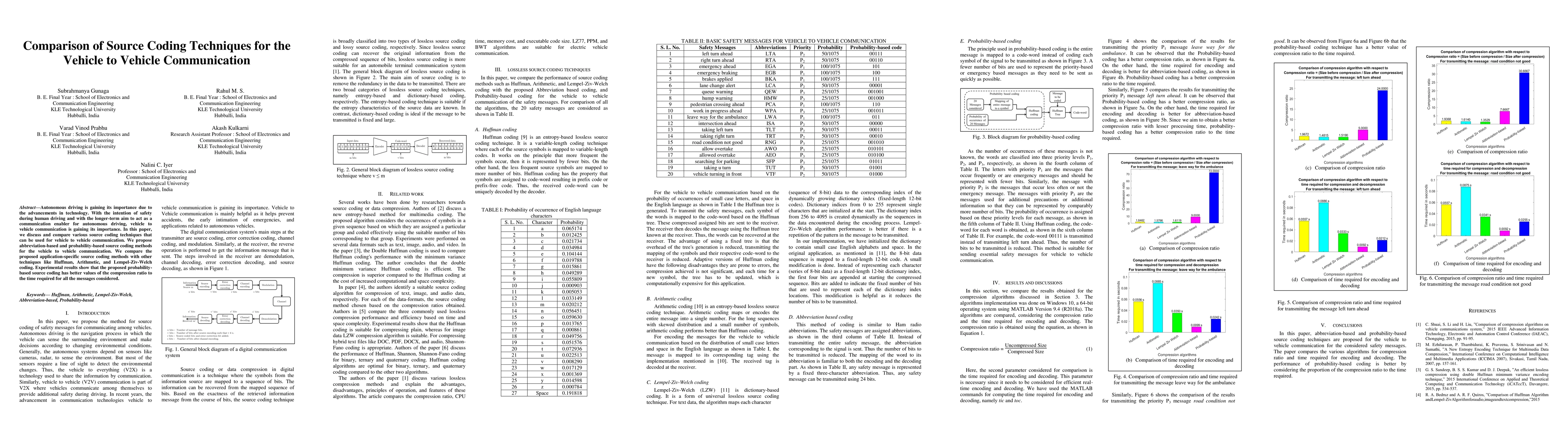 This paper compares various source coding techniques for vehicle-to-vehicle communication, proposing abbreviation-based and probability-based methods. Experimental results indicate that the proposed probability-based method achieves a better compression ratio compared to Huffman, Arithmetic, and Lempel-Ziv-Welch coding techniques.