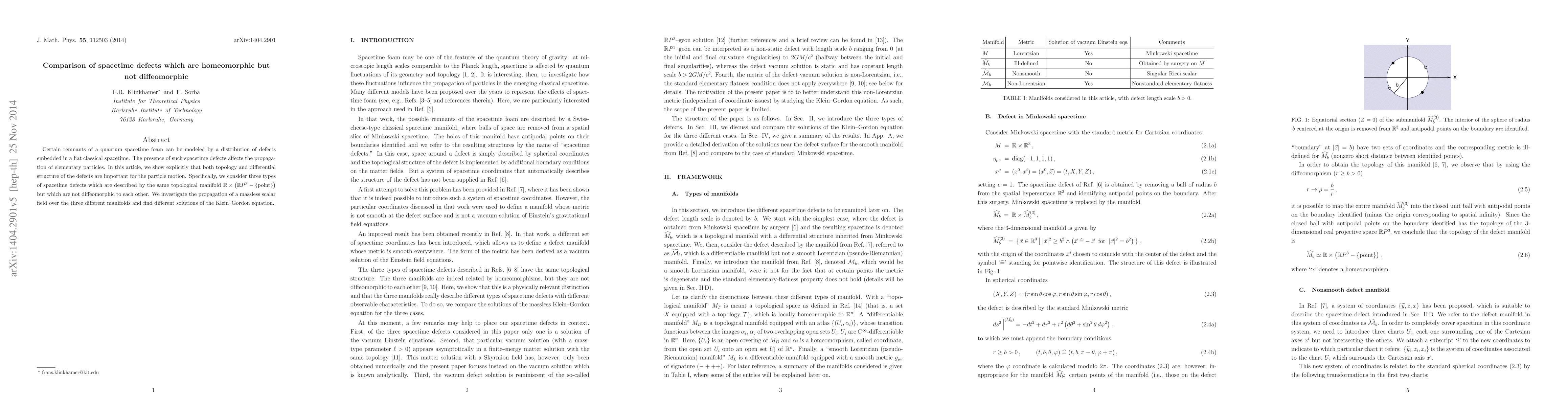 Certain remnants of a quantum spacetime foam can be modeled by a distribution of defects embedded in a flat classical spacetime. The presence of such spacetime defects affects the propagation of elementary particles. In this article, we show explicitly that both topology and differential structure of the defects are important for the particle motion. Specifically, we consider three types of spacetime defects which are described by the same topological manifold $\mathbb{R}\times\big(\mathbb{R}P^3-\{\text{point}\}\big)$ but which are not diffeomorphic to each other. We investigate the propagation of a massless scalar field over the three different manifolds and find different solutions of the \mbox{Klein--Gordon} equation.