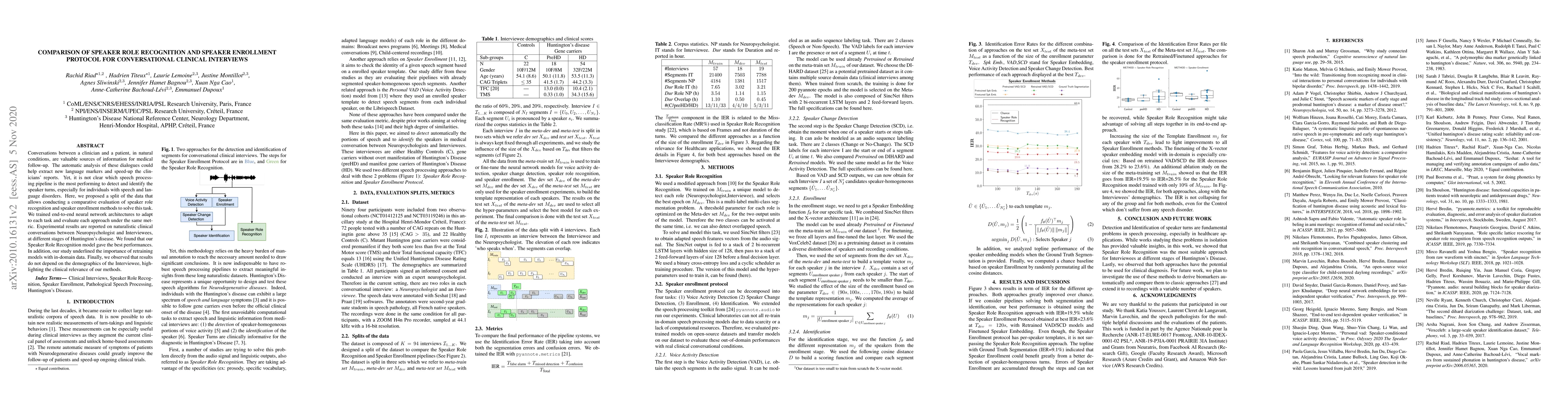 This paper compares speaker role recognition and speaker enrollment protocols for analyzing clinical interviews, finding that the speaker role recognition model performs best. The study emphasizes the importance of retraining models with in-domain data and notes that the results are demographically independent, underscoring the clinical relevance of the proposed methods.
