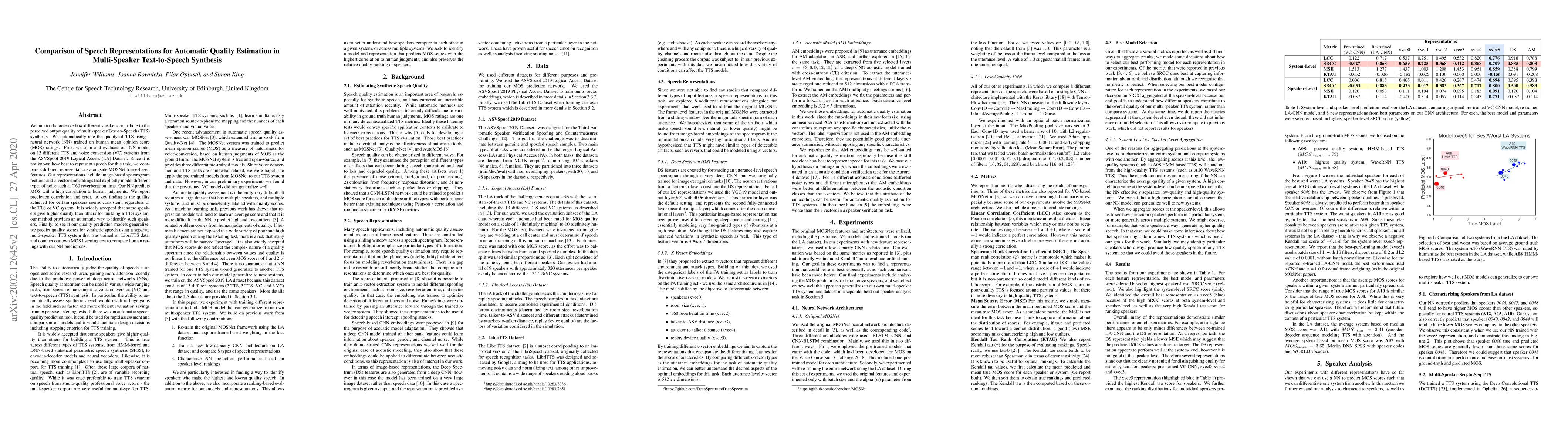 This paper compares various speech representations for estimating the quality of multi-speaker Text-to-Speech synthesis, using a neural network trained on human ratings. Key findings include consistent quality for certain speakers across different TTS systems, and the ability to automatically identify high-quality speakers.