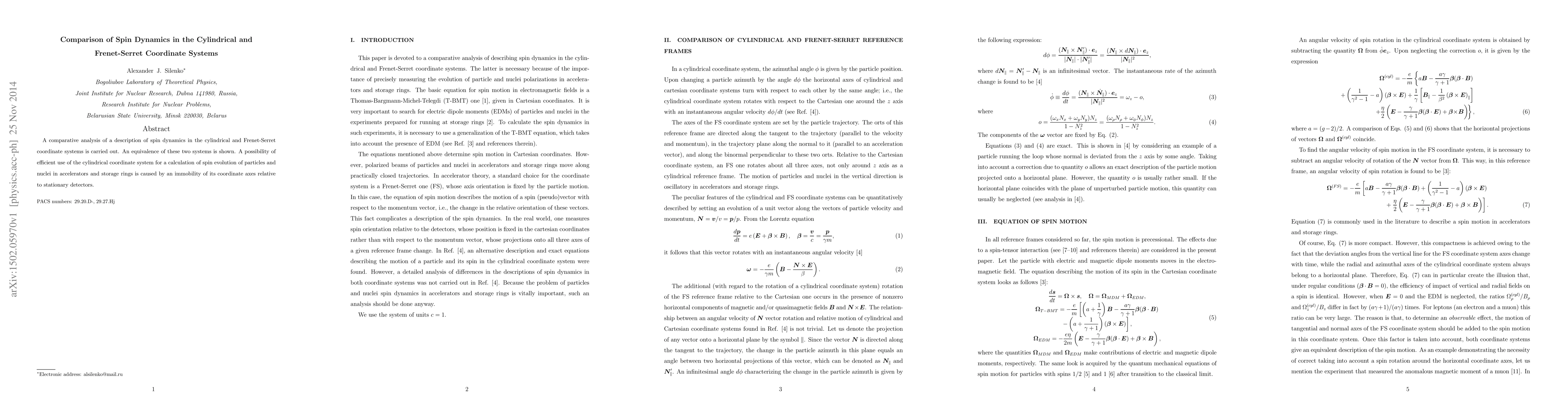 This paper compares spin dynamics in cylindrical and Frenet-Serret coordinate systems, demonstrating their equivalence. The cylindrical system's stationary axes make it particularly useful for calculating spin evolution in accelerators and storage rings.