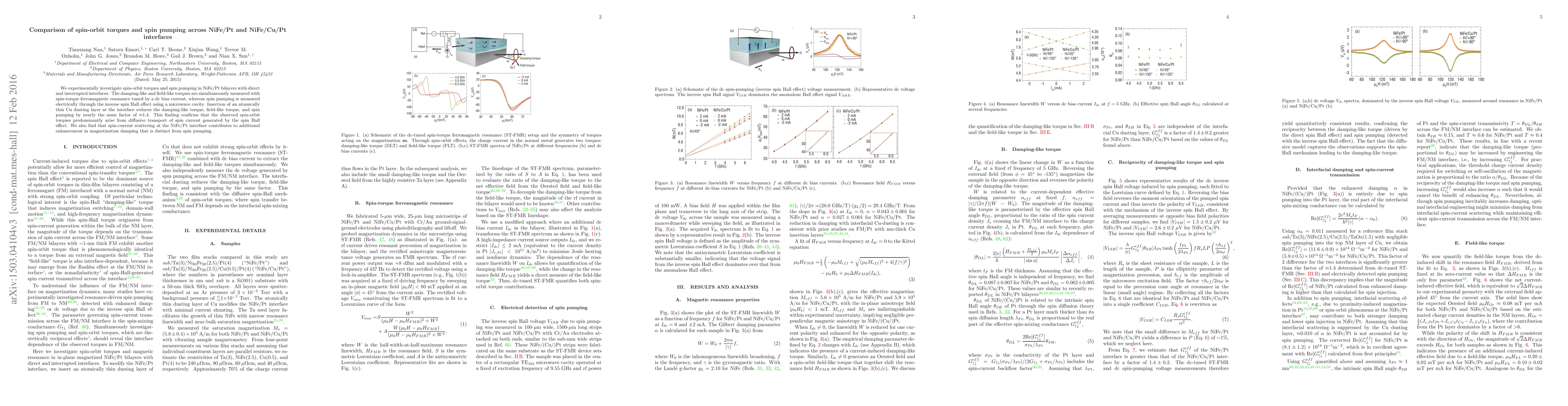 **Summary:** This study compares spin-orbit torques and spin pumping in NiFe/Pt bilayers with and without an atomically thin Cu layer. It finds that inserting Cu reduces both torques and spin pumping by a factor of ~1.4, suggesting spin Hall effect-driven spin current diffusion. Spin-current scattering at the NiFe/Pt interface contributes to additional damping beyond spin pumping.