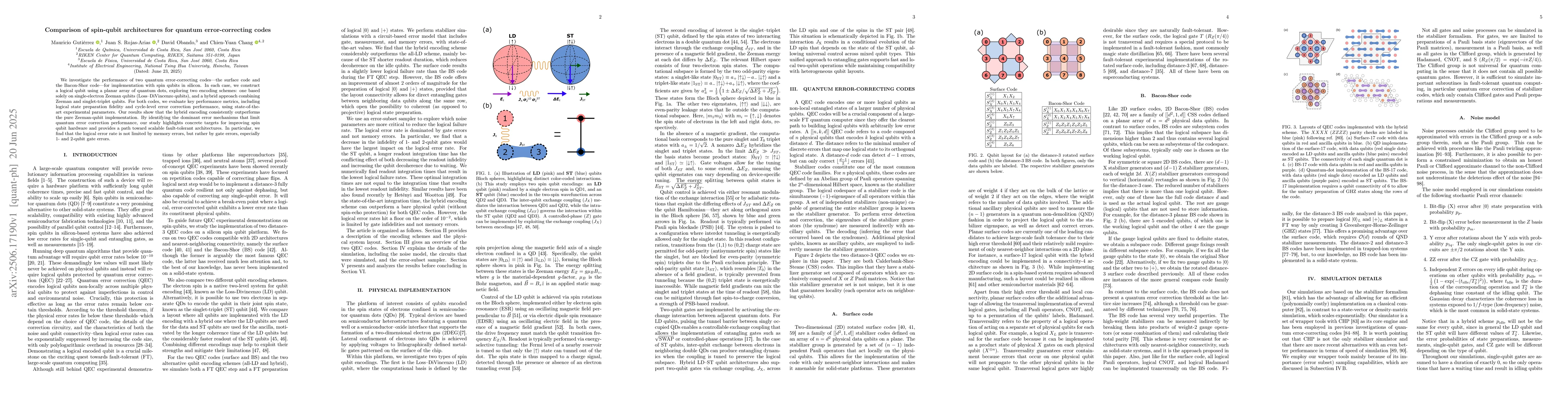 We investigate the performance of two quantum error-correcting codes, the surface code and the Bacon-Shor code, for implementation with spin qubits in silicon. In each case, we construct a logical qubit using a planar array of quantum dots, exploring two encoding schemes: one based solely on single-electron Zeeman qubits (Loss-DiVincenzo qubits), and a hybrid approach combining Zeeman and singlet-triplet qubits. For both codes, we evaluate key performance metrics, including logical state preparation fidelity and cycle-level error correction performance, using state-of-the-art experimental parameters. Our results show that the hybrid encoding consistently outperforms the pure Zeeman-qubit implementation. By identifying the dominant error mechanisms that limit quantum error correction performance, our study highlights concrete targets for improving spin qubit hardware and provides a path toward scalable fault-tolerant architectures. In particular, we find that the logical error rate is not limited by memory errors, but rather by gate errors, especially 1- and 2-qubit gate errors.