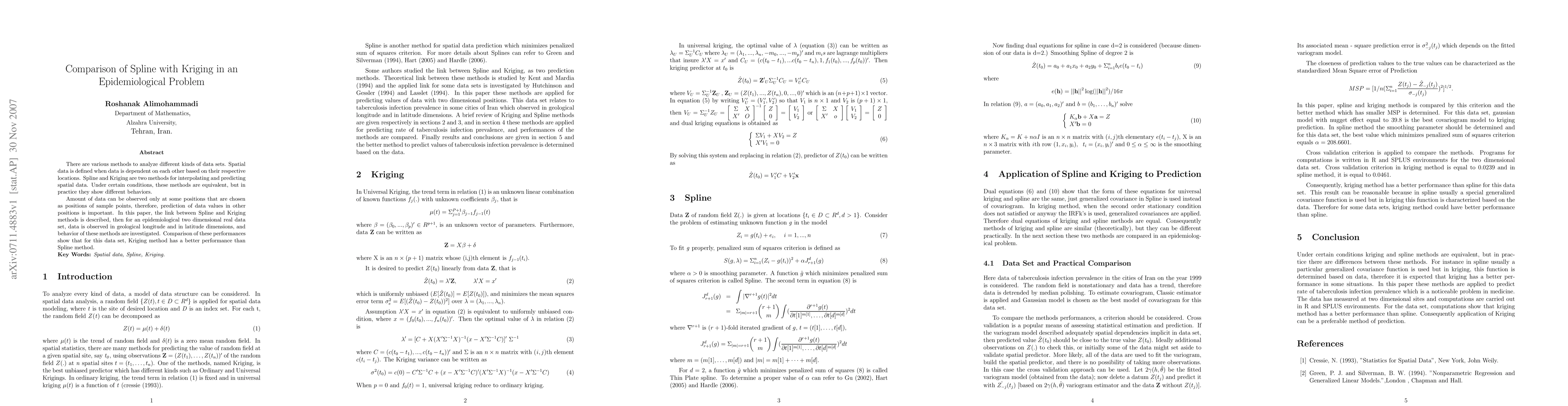 This paper compares Spline and Kriging methods for interpolating spatial data, finding that Kriging performs better on a 2D epidemiological dataset. The study highlights the difference in performance between these two methods under certain conditions.