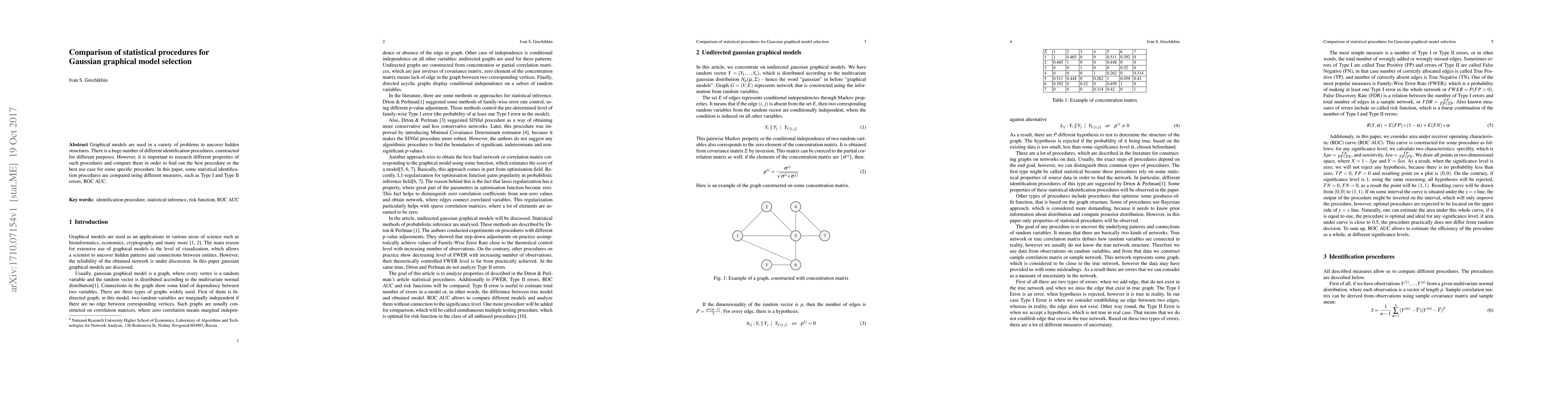 This paper compares different statistical procedures for identifying Gaussian graphical models, focusing on accuracy measures like Type I and II errors and ROC AUC, to find the best procedure for specific use cases.
