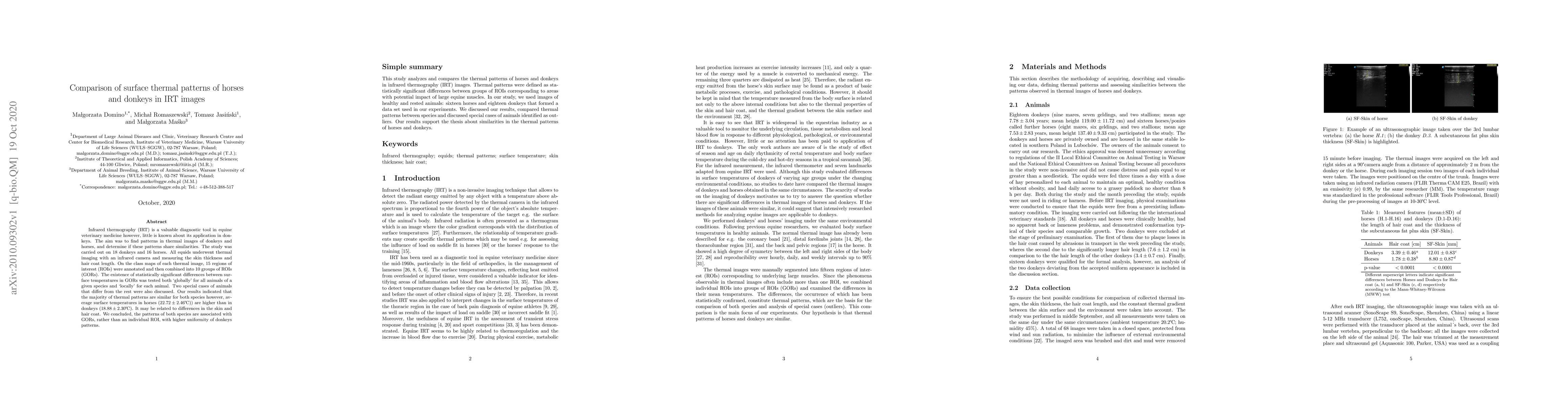 Infrared thermography (IRT) is a valuable diagnostic tool in equine veterinary medicine however, little is known about its application in donkeys. The aim was to find patterns in thermal images of donkeys and horses, and determine if these patterns share similarities. The study was carried out on 18 donkeys and 16 horses. All equids underwent thermal imaging with an infrared camera and measuring the skin thickness and hair coat length. On the class maps of each thermal image, 15 regions of interest (ROIs) were annotated and then combined into 10 groups of ROIs (GORs). The existence of statistically significant differences between surface temperatures in GORs was tested both `globally' for all animals of a given species and `locally' for each animal. Two special cases of animals that differ from the rest were also discussed. Our results indicated that the majority of thermal patterns are similar for both species however, average surface temperatures in horses are higher than in donkeys. It may be related to differences in the skin and hair coat. We concluded, the patterns of both species are associated with GORs, rather than an individual ROI, with higher uniformity of donkeys patterns.