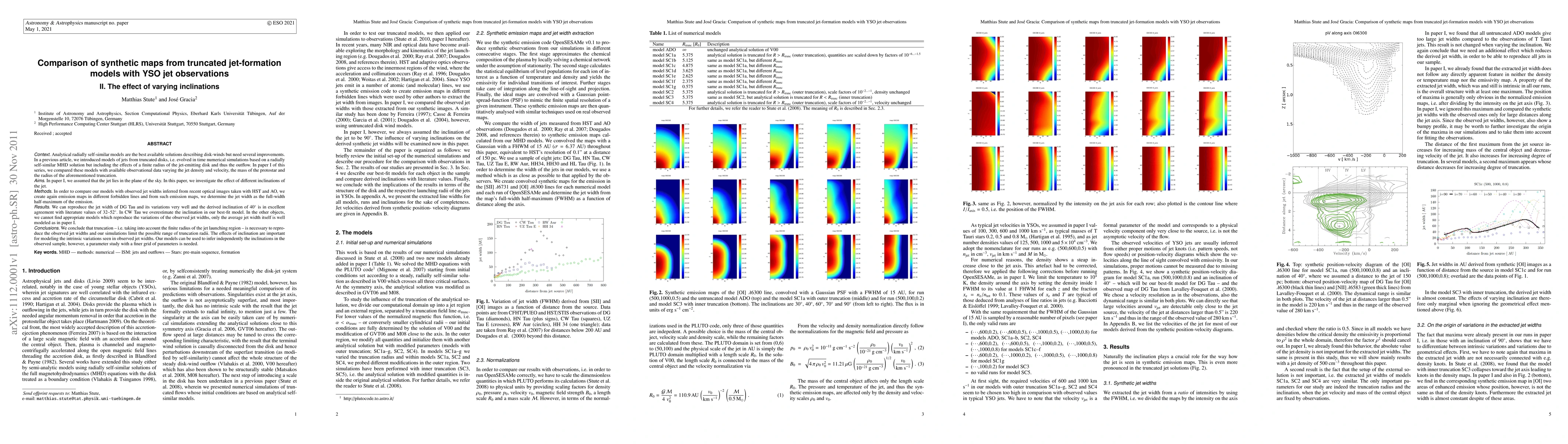 Analytical radially self-similar models are the best available solutions describing disk-winds but need several improvements. In a previous article, we introduced models of jets from truncated disks, i.e. evolved in time numerical simulations based on a radially self-similar MHD solution but including the effects of a finite radius of the jet-emitting disk and thus the outflow. In paper I of this series, we compared these models with available observational data varying the jet density and velocity, the mass of the protostar and the radius of the aforementioned truncation. In paper I, we assumed that the jet lies in the plane of the sky. In this paper, we investigate the effect of different inclinations of the jet. In order to compare our models with observed jet widths inferred from recent optical images taken with HST and AO, we create again emission maps in different forbidden lines and from such emission maps, we determine the jet width as the full-width half-maximum of the emission. We can reproduce the jet width of DG Tau and its variations very well and the derived inclination of 40$^\circ$ is in excellent agreement with literature values of 32--52$^\circ$. In CW Tau we overestimate the inclination in our best-fit model. In the other objects, we cannot find appropriate models which reproduce the variations of the observed jet widths, only the average jet width itself is well modeled as in paper I. We conclude that truncation -- i.e. taking into account the finite radius of the jet launching region -- is necessary to reproduce the observed jet widths and our simulations limit the possible range of truncation radii. The effects of inclination are important for modeling the intrinsic variations seen in observed jet widths. Our models can be used to infer independently the inclinations in the observed sample, however, a parameter study with a finer grid of parameters is needed.