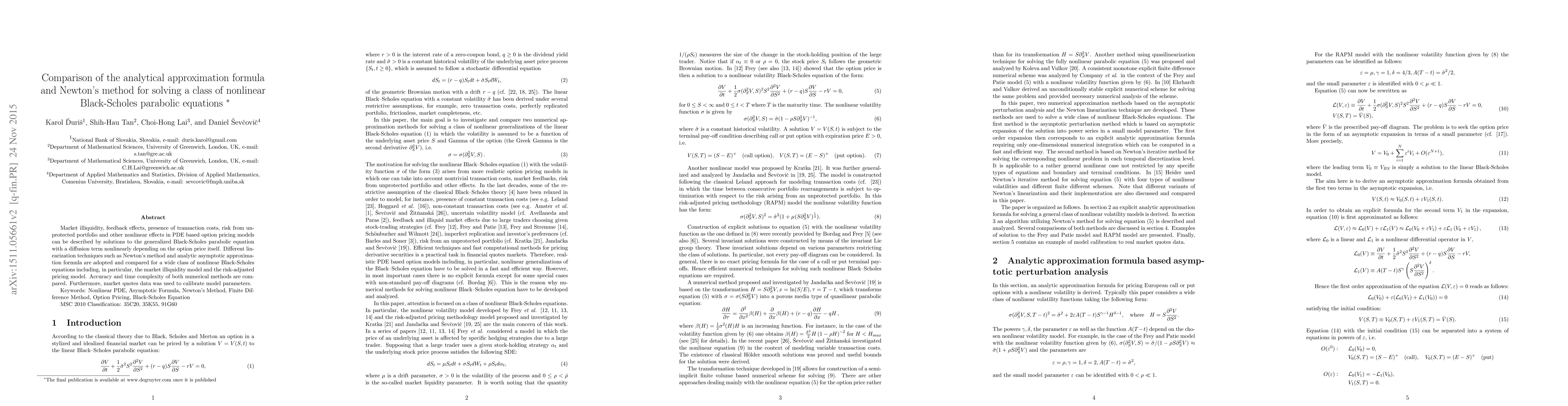 This research compares the accuracy and efficiency of Newton's method and an analytic approximation formula in solving nonlinear Black-Scholes equations, which account for market illiquidity and other nonlinear effects. The study uses market quotes for parameter calibration and finds that both methods have distinct advantages depending on the specific equation and desired precision.