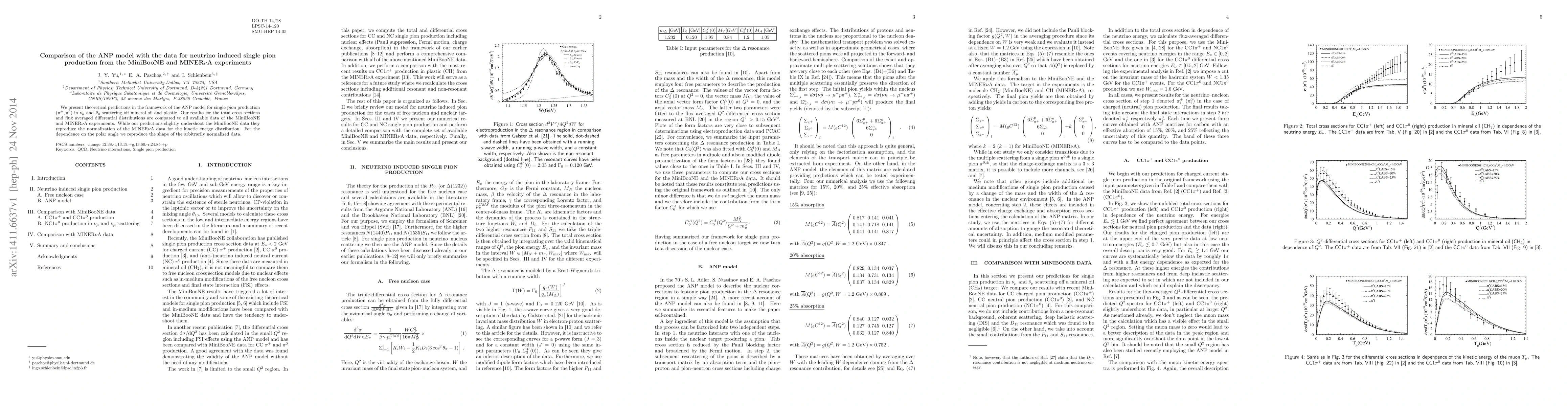 This paper compares theoretical predictions from the ANP model for neutrino-induced single pion production with experimental data from the MiniBooNE and MINER$\nu$A experiments. The ANP model slightly undershoots MiniBooNE data but accurately reproduces MINER$\nu$A data for kinetic energy distribution and angle dependence.