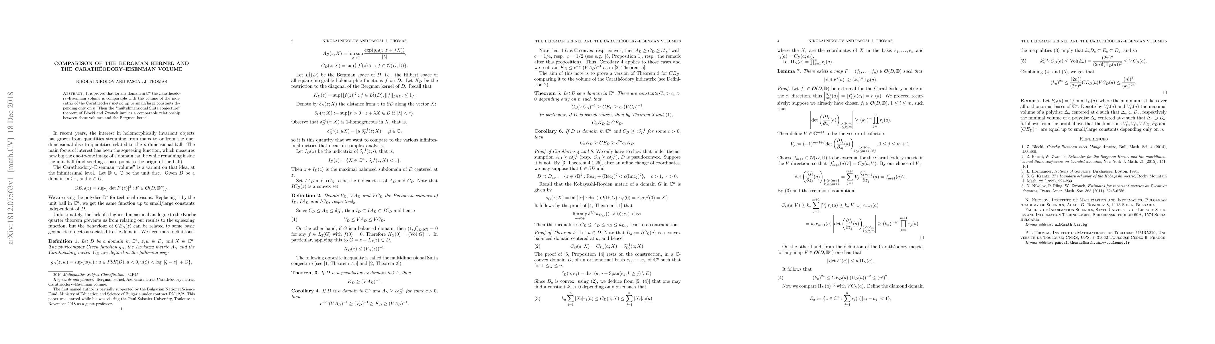 This paper proves that the Carathéodory--Eisenman volume of a domain in $\mathbb{C}^n$ is comparable to the volume of the indicatrix of the Carathéodory metric, and further establishes a comparable relationship between these volumes and the Bergman kernel via the multidimensional Suita conjecture theorem.