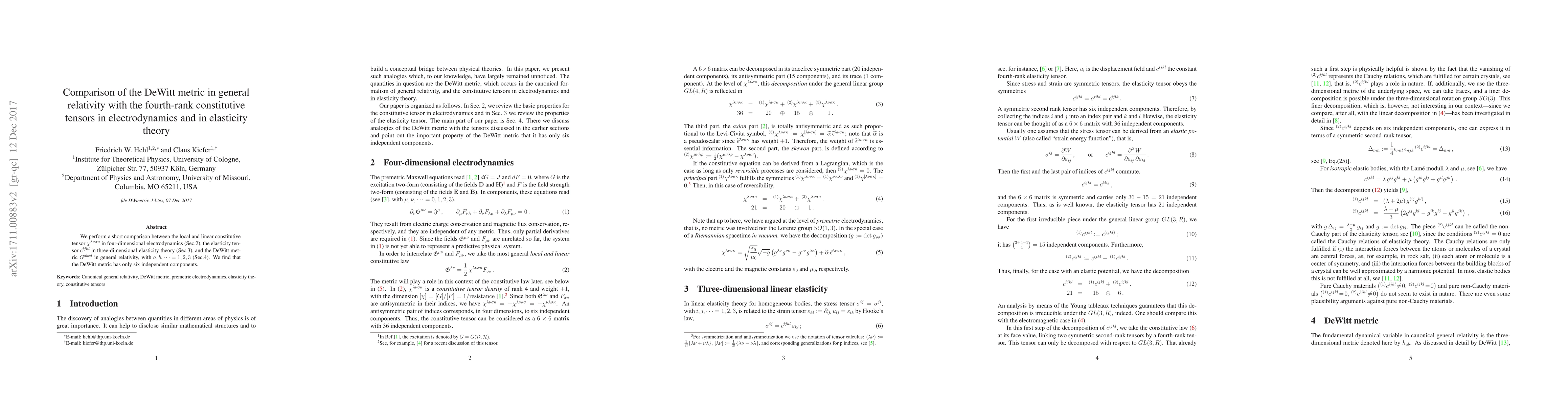 We perform a short comparison between the local and linear constitutive tensor $\chi^{\lambda\nu\sigma\kappa}$ in four-dimensional electrodynamics (Sec.2), the elasticity tensor $c^{ijkl}$ in three-dimensional elasticity theory (Sec.3), and the DeWitt metric $G^{abcd}$ in general relativity, with ${a,b,\dots=1,2,3}$ (Sec.4). We find that the DeWitt metric has only six independent components.