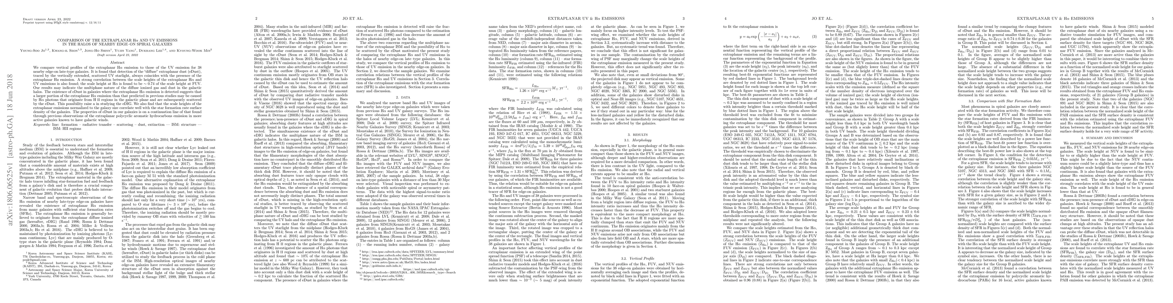 This paper compares extraplanar H$\alpha$ and UV emissions in the halos of 38 nearby edge-on spiral galaxies, finding a strong correlation between the scale heights of these emissions and suggesting the multiphase nature of the diffuse ionized gas and dust. The study indicates that scattered H$\alpha$ photons from the galactic plane may contribute significantly to the extraplanar H$\alpha$ emission.
