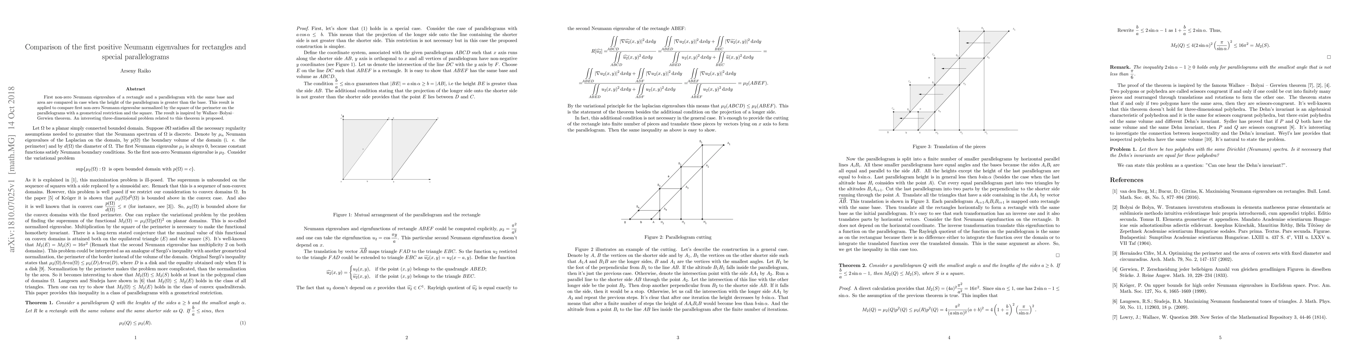 This paper compares the first positive Neumann eigenvalues of rectangles and special parallelograms with the same base and area, focusing on cases where the parallelogram's height exceeds the base. It extends the comparison to normalized eigenvalues and proposes a related three-dimensional problem inspired by the Wallace--Bolyai--Gerwien theorem.
