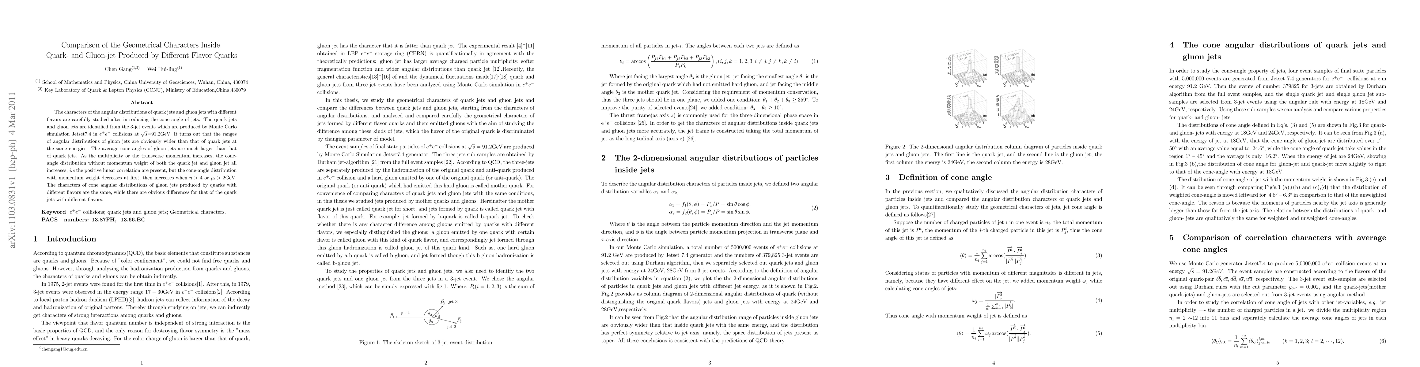 This study compares the angular distributions of quark jets and gluon jets produced in e+e- collisions, finding that gluon jets have wider ranges and larger average cone angles than quark jets, with similar characteristics for gluon jets regardless of quark flavor.