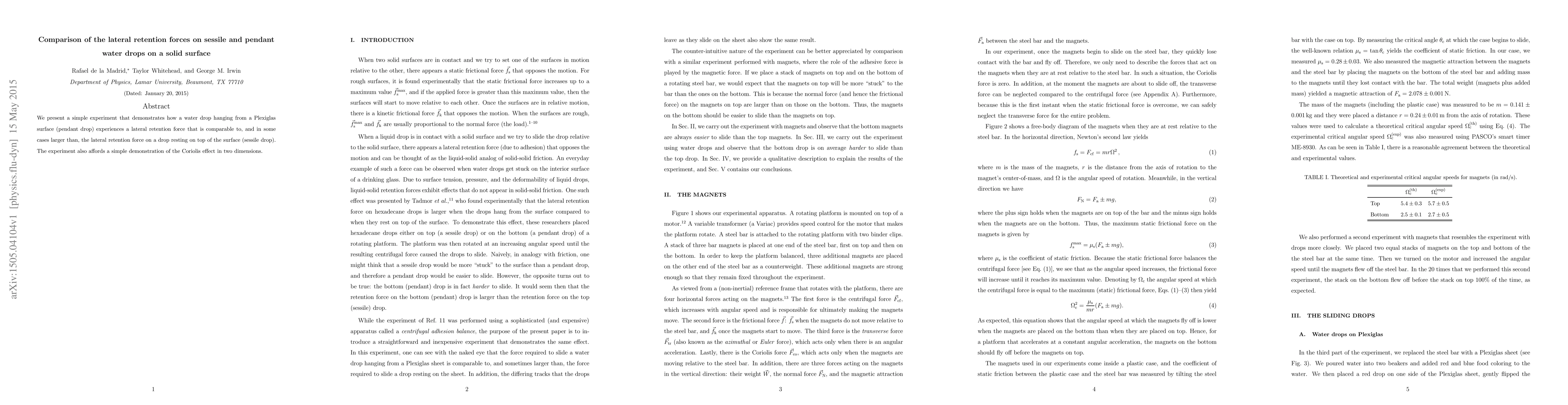 This study demonstrates that pendant water drops hanging from a surface experience lateral retention forces comparable or greater than those on sessile drops resting on a surface, showcasing the Coriolis effect in a simple two-dimensional experiment.