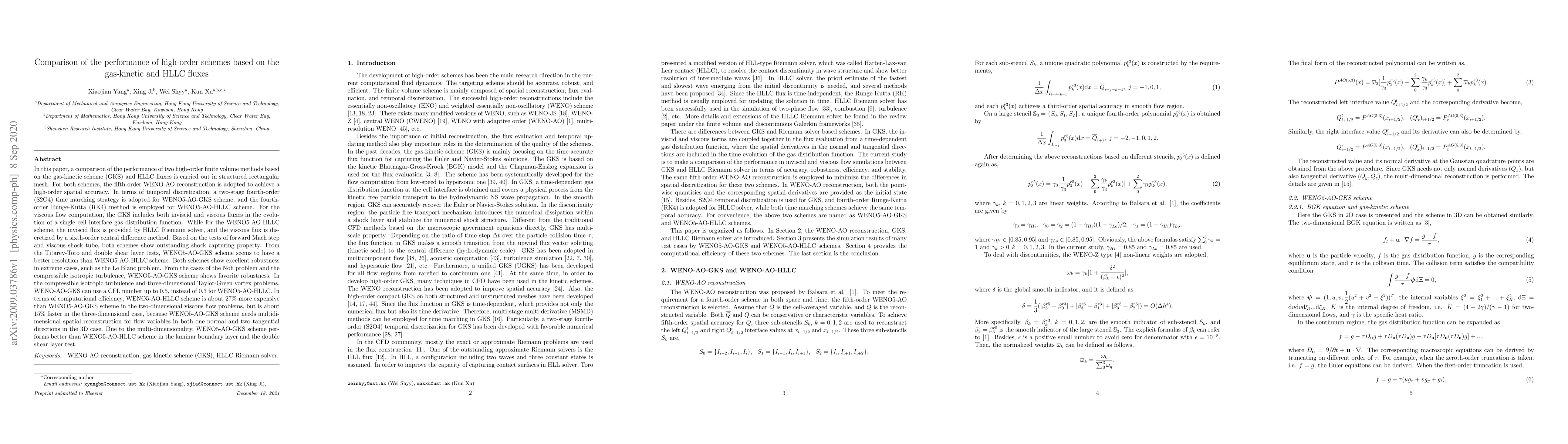 In this paper, a comparison of the performance of two high-order finite volume methods based on the gas-kinetic scheme (GKS) and HLLC fluxes is carried out in structured rectangular mesh. For both schemes, the fifth-order WENO-AO reconstruction is adopted to achieve a high-order spatial accuracy. In terms of temporal discretization, a two-stage fourth-order (S2O4) time marching strategy is adopted for WENO5-AO-GKS scheme, and the fourth-order Runge-Kutta (RK4) method is employed for WENO5-AO-HLLC scheme. For the viscous flow computation, the GKS includes both inviscid and viscous fluxes in the evolution of a single cell interface gas distribution function. While for the WENO5-AO-HLLC scheme, the inviscid flux is provided by HLLC Riemann solver, and the viscous flux is discretized by a sixth-order central difference method. Based on the tests of forward Mach step and viscous shock tube, both schemes show outstanding shock capturing property. From the Titarev-Toro and double shear layer tests, WENO5-AO-GKS scheme seems to have a better resolution than WENO5-AO-HLLC scheme. Both schemes show excellent robustness in extreme cases, such as the Le Blanc problem. From the cases of the Noh problem and the compressible isotropic turbulence, WENO5-AO-GKS scheme shows favorite robustness. In the compressible isotropic turbulence and three-dimensional Taylor-Green vortex problems, WENO-AO-GKS can use a CFL number up to 0.5, instead of 0.3 for WENO5-AO-HLLC. In terms of computational efficiency, WENO5-AO-HLLC scheme is about 27% more expensive than WENO5-AO-GKS scheme in the two-dimensional viscous flow problems, but is about 15% faster in the three-dimensional case. Due to the multi-dimensionality, WENO5-AO-GKS scheme performs better than WENO5-AO-HLLC scheme in the laminar boundary layer and the double shear layer test.