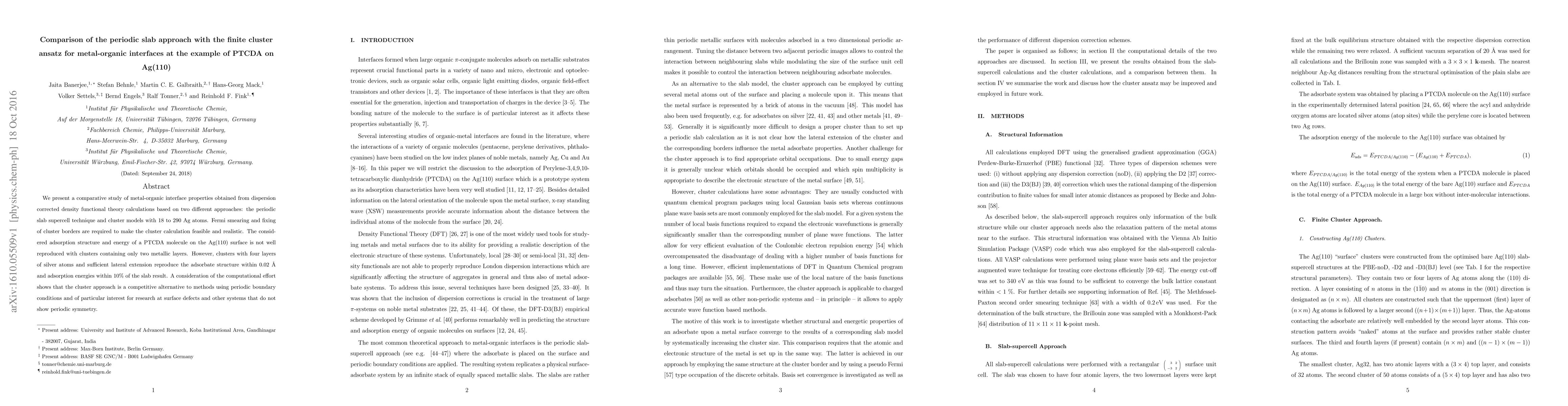 A study compares two methods for modeling metal-organic interfaces using density functional theory calculations. It finds that a cluster approach with four layers of silver atoms is competitive to periodic slab supercell techniques and can accurately reproduce adsorption structures and energies.