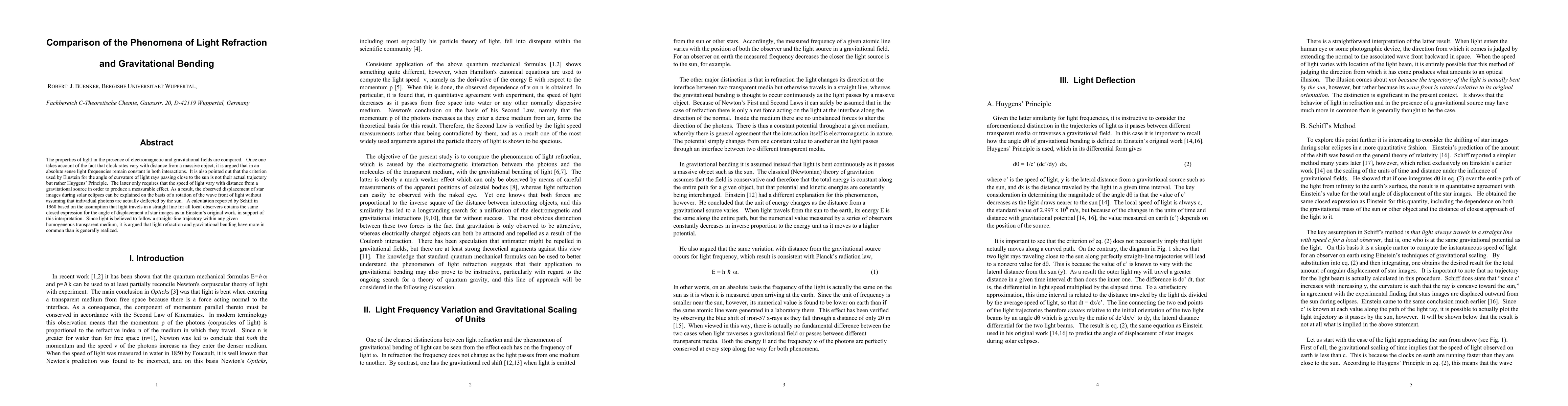 The properties of light in the presence of electromagnetic and gravitational fields are compared. Once one takes account of the fact that clock rates vary with distance from a massive object, it is argued that in an absolute sense light frequencies remain constant in both interactions. It is also pointed out that the criterion used by Einstein for the angle of curvature of light rays passing close to the sun is not their actual trajectory but rather Huygens' Principle. The latter only requires that the speed of light vary with distance from a gravitational source in order to produce a measurable effect. As a result, the observed displacement of star images during solar eclipses can be explained on the basis of a rotation of the wave front of light without assuming that individual photons are actually deflected by the sun. A calculation reported by Schiff in 1960 based on the assumption that light travels in a straight line for all local observers obtains the same closed expression for the angle of displacement of star images as in Einstein's original work, in support of this interpretation. Since light is believed to follow a straight-line trajectory within any given homogeneous transparent medium, it is argued that light refraction and gravitational bending have more in common than is generally realized.