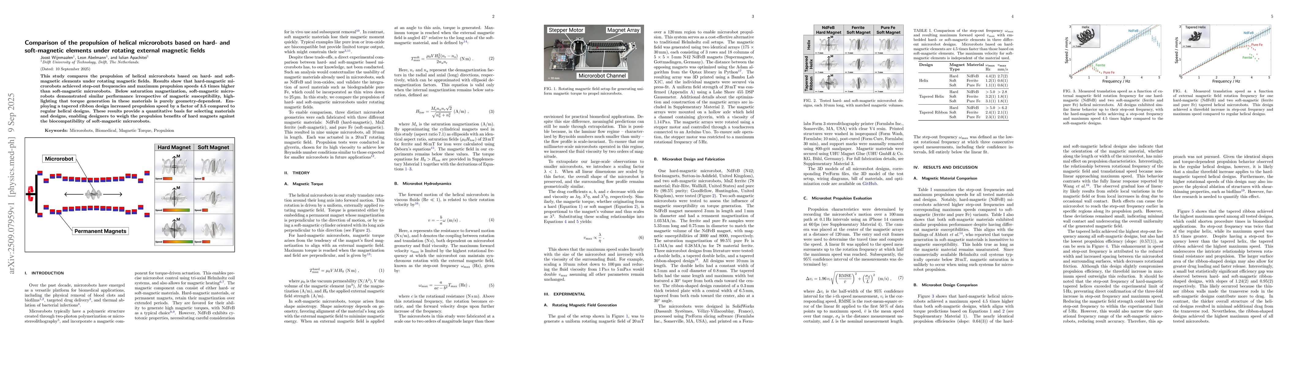 This study compares the propulsion of helical microrobots based on hard- and soft-magnetic elements under rotating magnetic fields. Results show that hard-magnetic microrobots achieved step-out frequencies and maximum propulsion speeds 4.5 times higher than soft-magnetic microrobots. Below saturation magnetization, soft-magnetic micro-robots demonstrated similar performance irrespective of magnetic susceptibility, high-lighting that torque generation in these materials is purely geometry-dependent. Employing a tapered ribbon design increased propulsion speed by a factor of 3.5 compared to regular helical designs. These results provide a quantitative basis for selecting materials and designs, enabling designers to weigh the propulsion benefits of hard magnets against the biocompatibility of soft-magnetic microrobots.