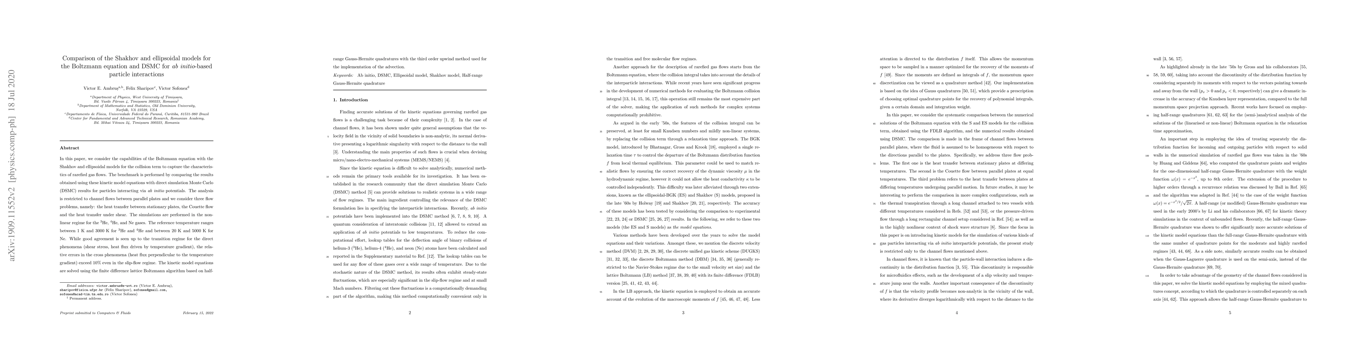 In this paper, we consider the capabilities of the Boltzmann equation with the Shakhov and ellipsoidal models for the collision term to capture the characteristics of rarefied gas flows. The benchmark is performed by comparing the results obtained using these kinetic model equations with direct simulation Monte Carlo (DSMC) results for particles interacting via ab initio potentials. The analysis is restricted to channel flows between parallel plates and we consider three flow problems, namely: the heat transfer between stationary plates, the Couette flow and the heat transfer under shear. The simulations are performed in the non-linear regime for the 3He, 4He, and Ne gases. The reference temperature ranges between 1 K and 3000 K for 3He and 4He and between 20 K and 5000 K for Ne. While good agreement is seen up to the transition regime for the direct phenomena (shear stress, heat flux driven by temperature gradient), the relative errors in the cross phenomena (heat flux perpendicular to the temperature gradient) exceed 10% even in the slip-flow regime. The kinetic model equations are solved using the finite difference lattice Boltzmann algorithm based on half-range Gauss-Hermite quadratures with the third order upwind method used for the implementation of the advection.