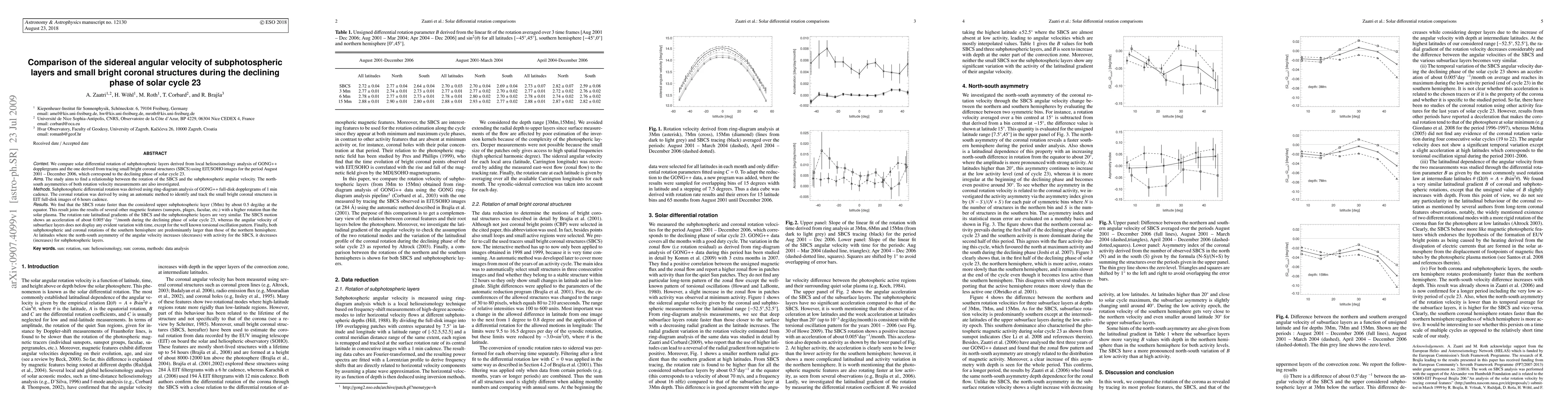 This study compares solar differential rotation of subphotospheric layers from helioseismology analysis of GONG++ dopplergrams with that of small bright coronal structures (SBCS) from EIT/SOHO images during solar cycle 23's decline. Key findings include SBCS rotating faster than the upper subphotospheric layer by ~0.5 deg/day at the equator, similar latitudinal gradient trends, and SBCS acceleration during the cycle's decline, contrasting with stable subphotospheric rotation. Both hemispheres show larger rotations, but their north-south asymmetry patterns differ.